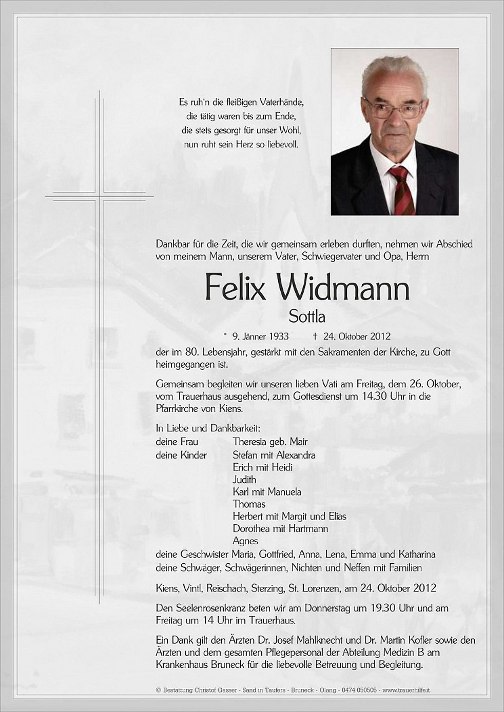 Gemeinsam begleiten wir unseren lieben Vati am Freitag, dem 26. Oktober, vom Trauerhaus ausgehend, zum Gottesdienst um 14.30 Uhr in die Pfarrkirche von Kiens.