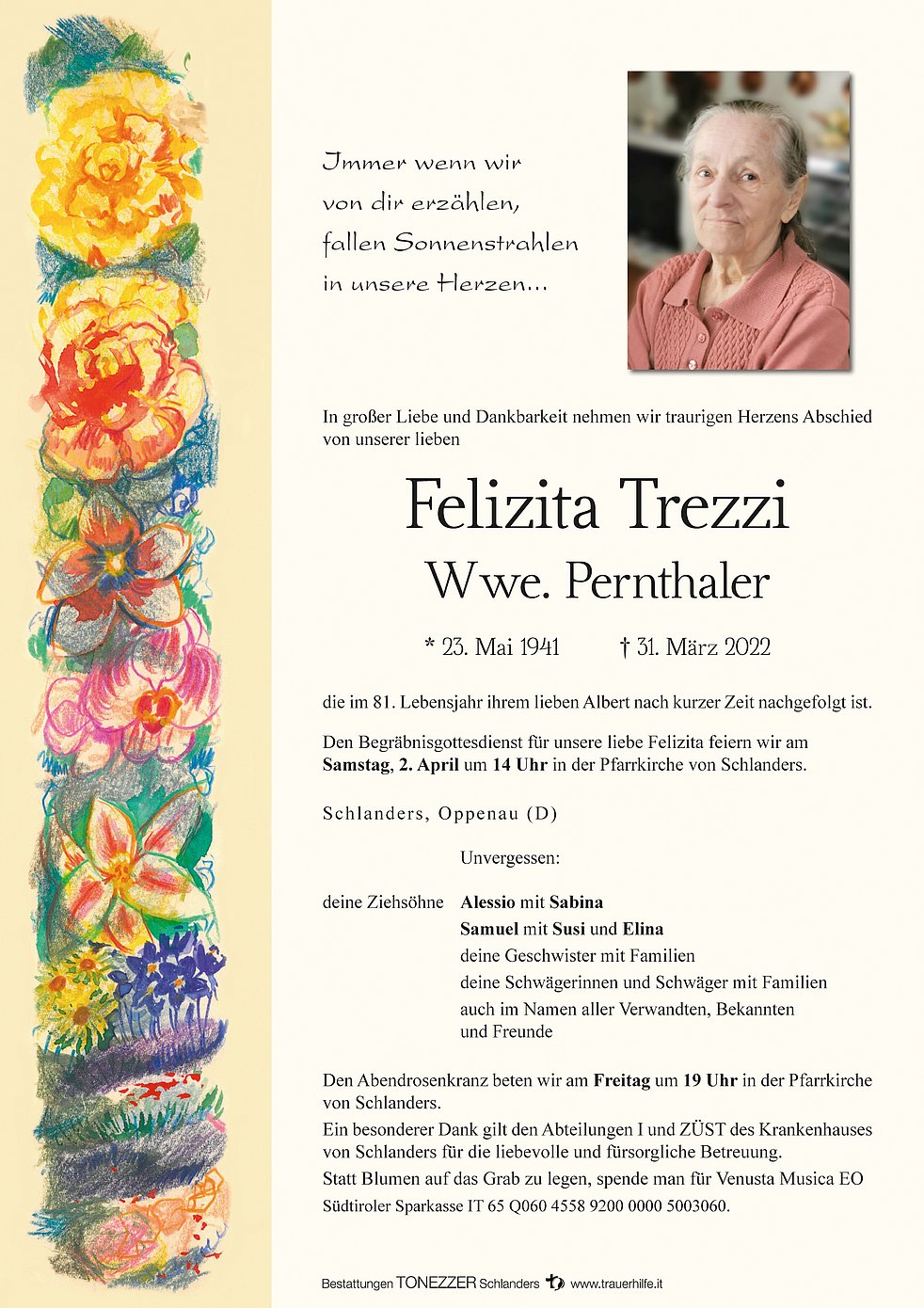 Den Begräbnisgottesdienst für unsere liebe Felizita feiern wir am Samstag, 2. April um 14 Uhr in der Pfarrkirche von Schlanders.