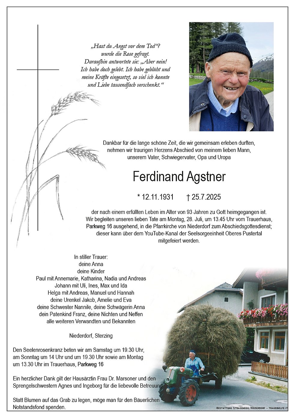 Begräbnisgottesdienst: 28.07. - 14:00 Uhr Niederdorf