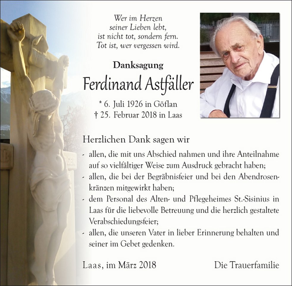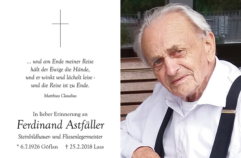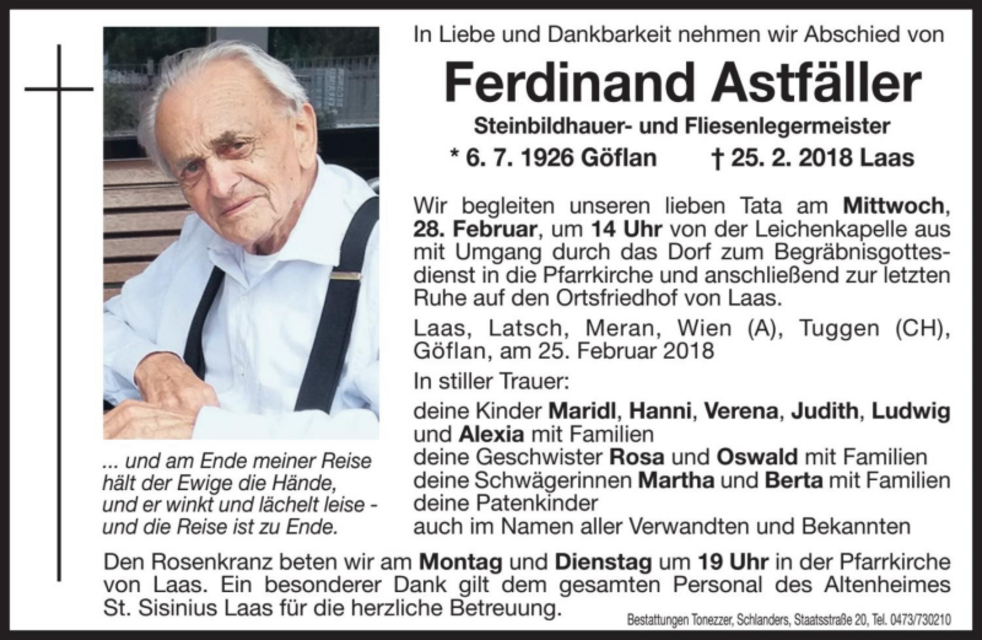 Wir begleiten unseren lieben Tata am Mittwoch, 28. Februar, um 14 Uhr von der Leichenkapelle aus mit Umgang durch das Dorf zum Begräbnisgottesdienst in die Pfarrkirche und anschließend zur letzten Ruhe auf den Ortsfriedhof von Laas.