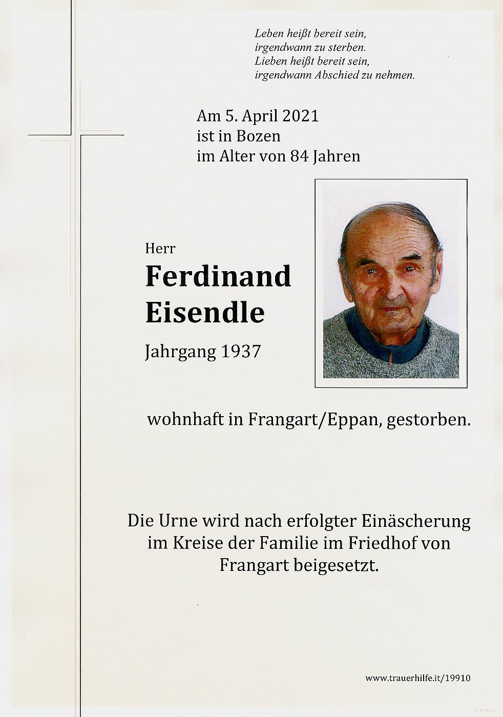 Die Urne wird nach erfolgter Einäscherung im Kreise der Familie im Friedhof von Frangart beigesetzt.