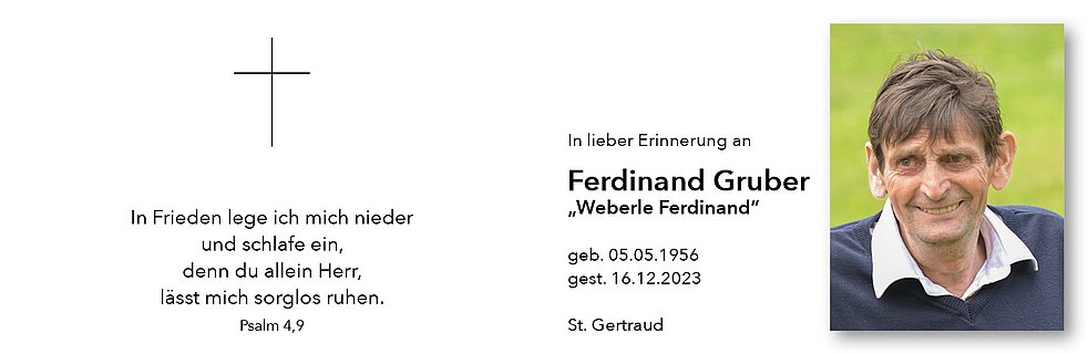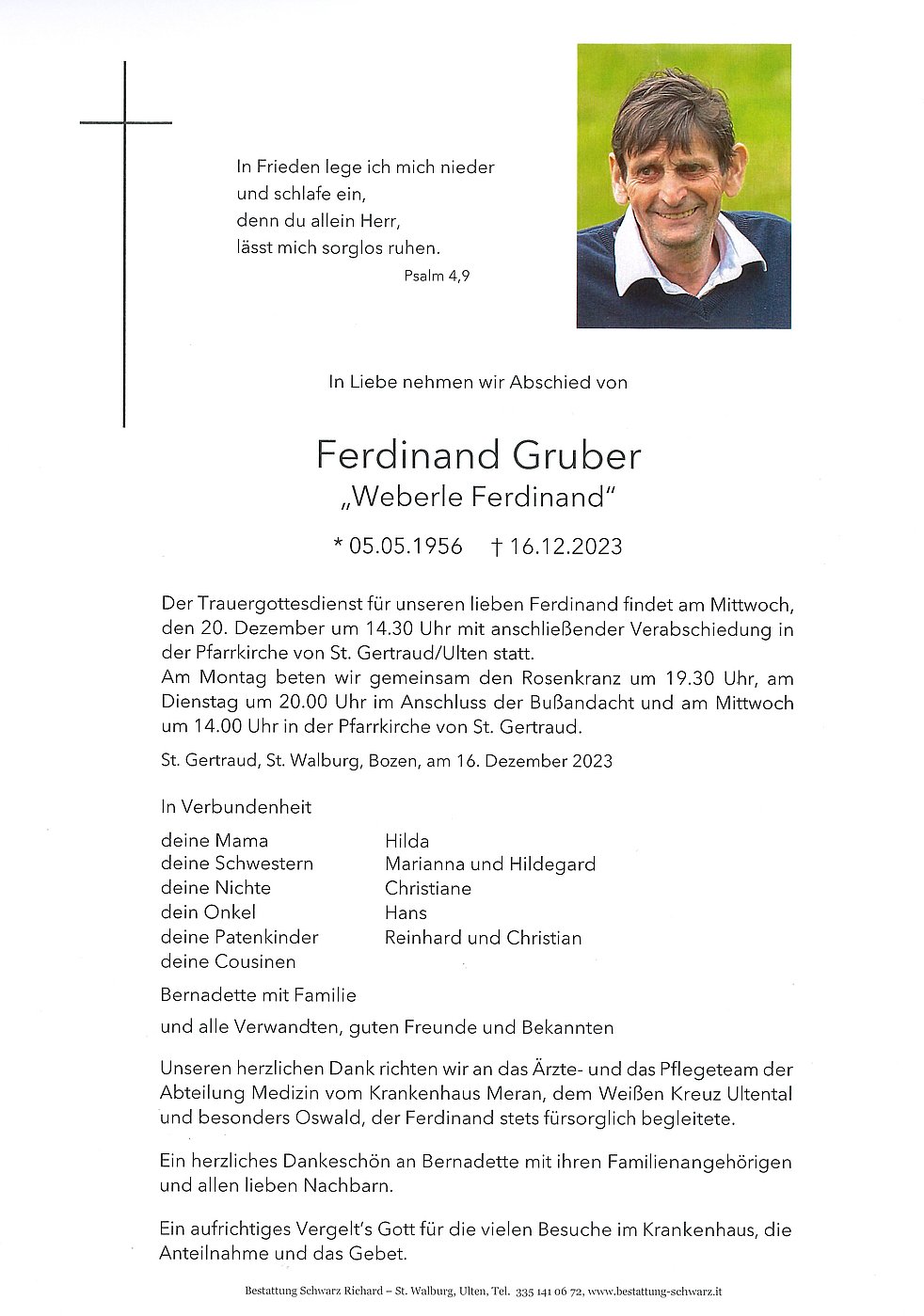 Der Trauergottesdienst für unseren lieben Ferdinand findet am Mittwoch, den 20. Dezember um 14.30 Uhr mit anschließender Verabschiedung in der Pfarrkirche von St. Gertraud/Ulten statt.