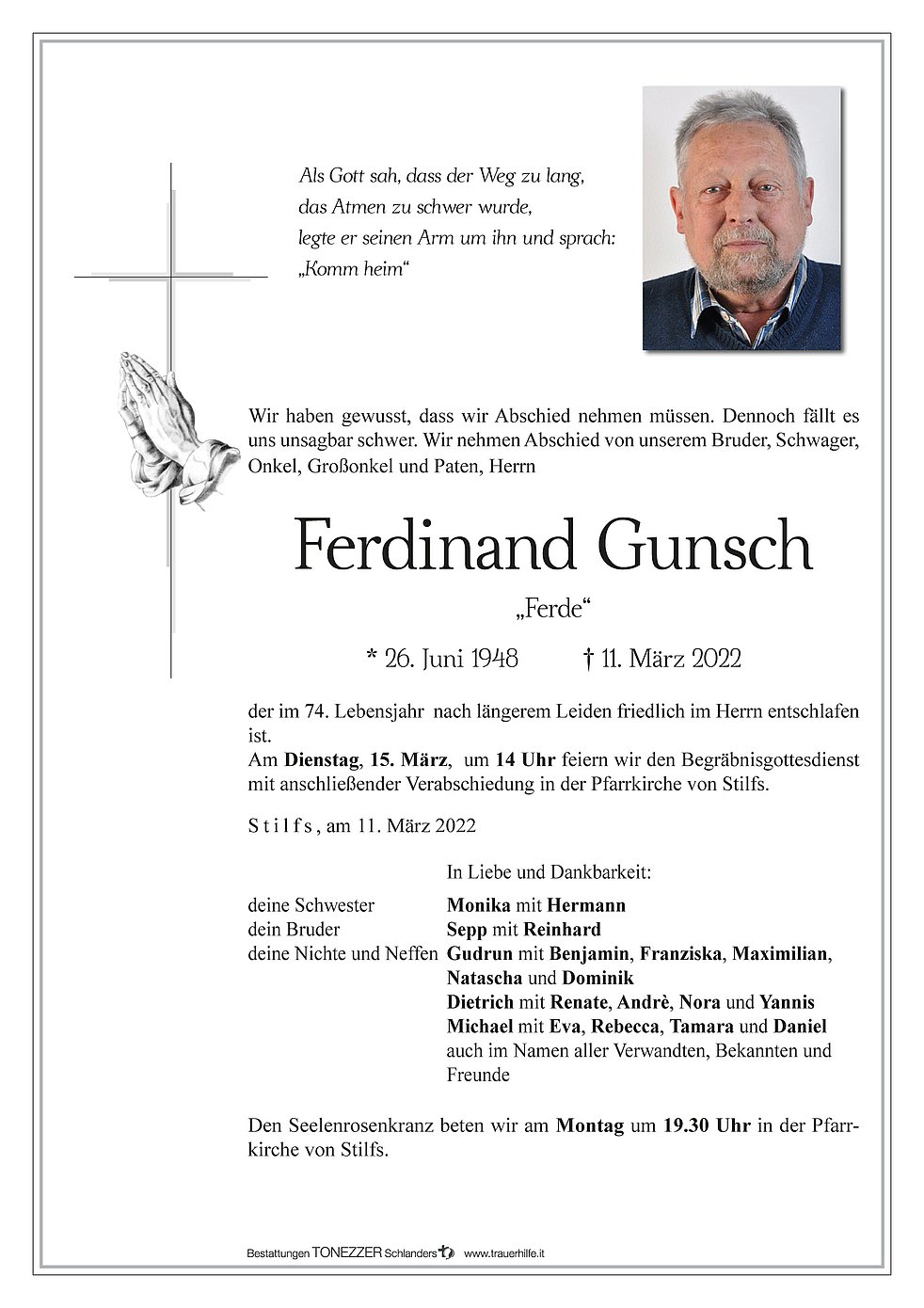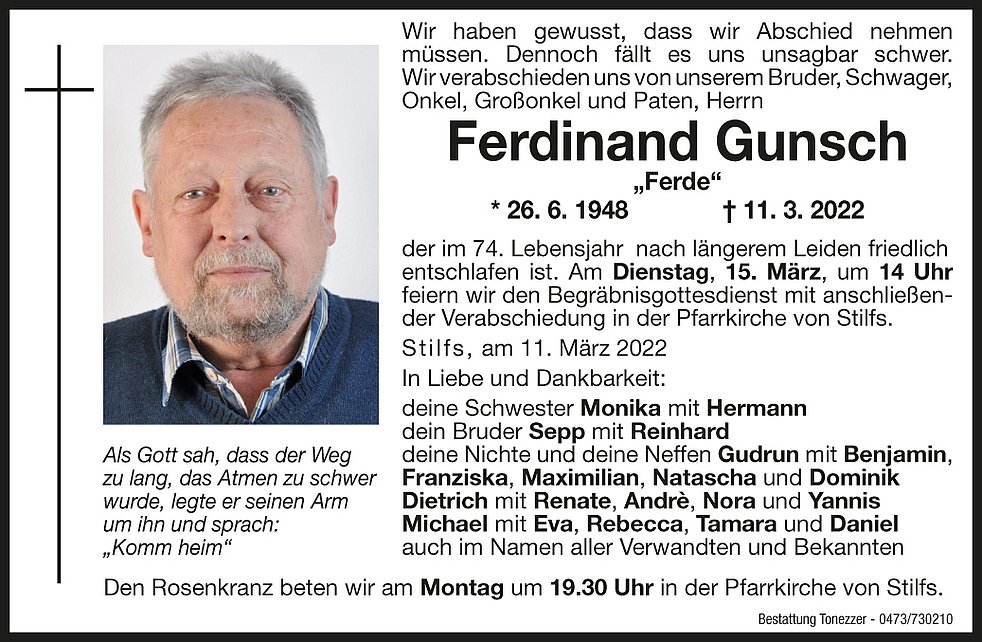 Am Dienstag, 15. März, um 14 Uhr feiern wir den Begräbnisgottesdienst mit anschließender Verabschiedung in der Pfarrkirche von Stilfs.
