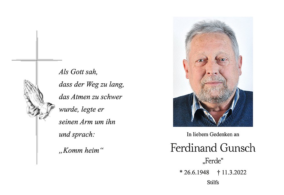 Wir haben gewusst, dass wir Abschied nehmen müssen. Dennoch fällt es uns unsagbar schwer. Wir nehmen Abschied von unserem Bruder, Schwager, Onkel, Großonkel und Paten, Herrn