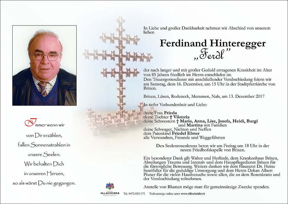Weiters danken wir dem Hausarzt Dr. Heinz Santifaller für die geduldige Umsorgung und dem Herrn Dekan Albert Pixner für die vielen Hausbesuche sowie allen, die an dem Rosenkranz und der Verabschiedung teilnehmen.