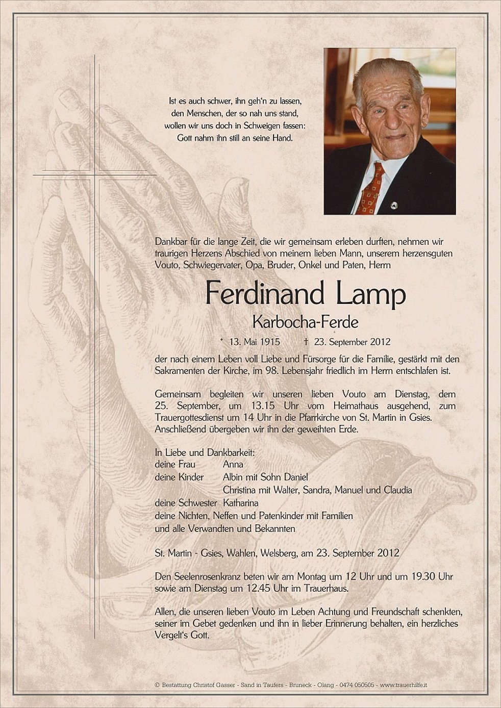 25. September, um 13.15 Uhr vom Heimathaus ausgehend, zum Trauergottesdienst um 14 Uhr in die Pfarrkirche von St. Martin in Gsies. Anschließend übergeben wir ihn der geweihten Erde.