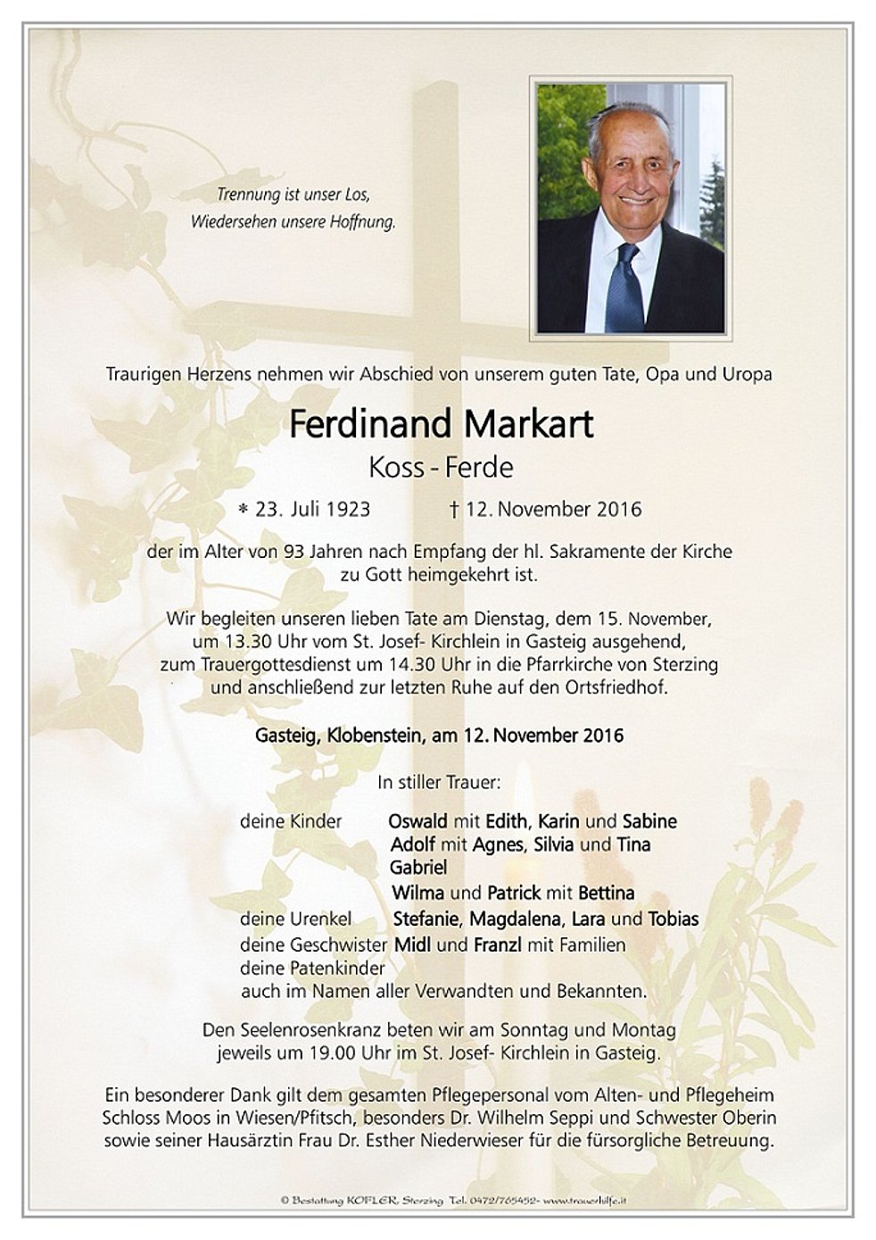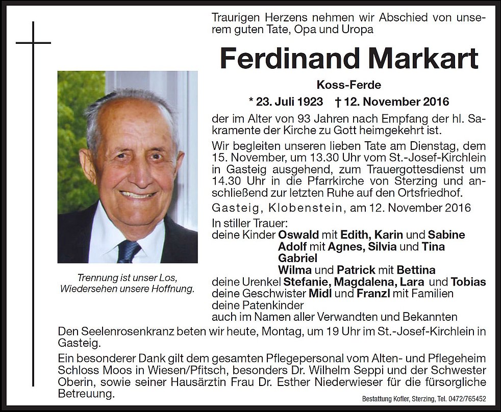 Wir begleiten unseren lieben Tate am Dienstag, dem 15. November, um 13.30 Uhr vom St. Josef- Kirchlein in Gasteig ausgehend, zum Trauergottesdienst um 14.30 Uhr in die Pfarrkirche von Sterzing und anschließend zur letzten Ruhe auf den Ortsfriedhof.