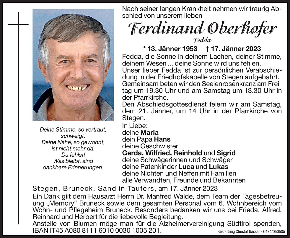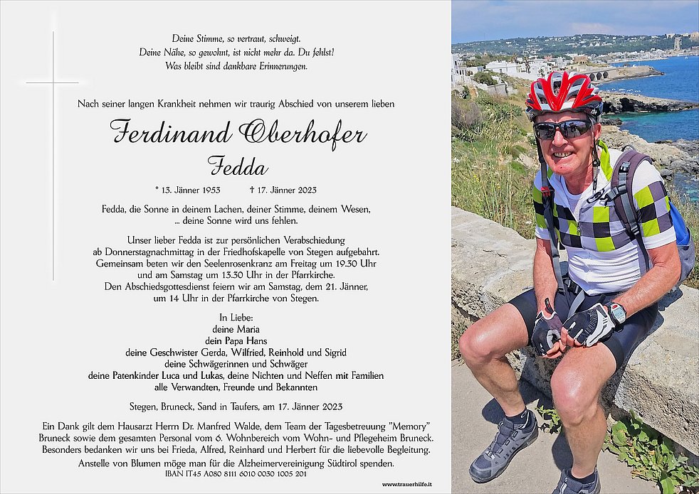 Anstelle von Blumen möge man für die Alzheimervereinigung Südtirol spenden.