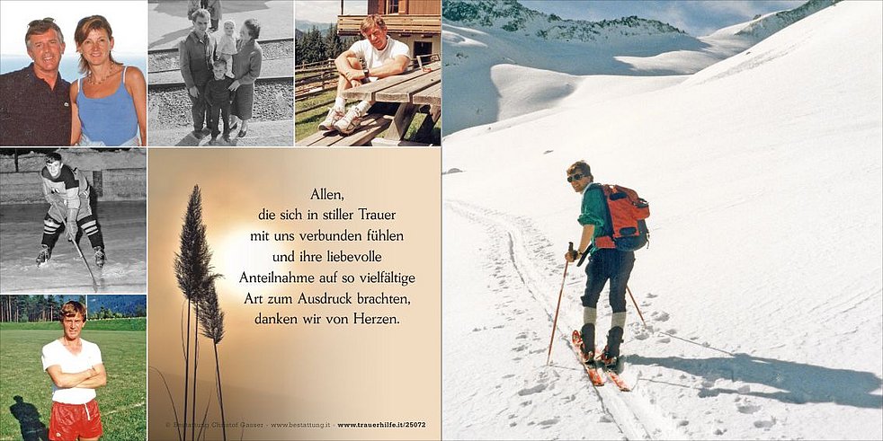 Ein Dank gilt dem Hausarzt Herrn Dr. Manfred Walde, dem Team der Tagesbetreuung "Memory" Bruneck sowie dem gesamten Personal vom 6. Wohnbereich vom Wohn- und Pflegeheim Bruneck.