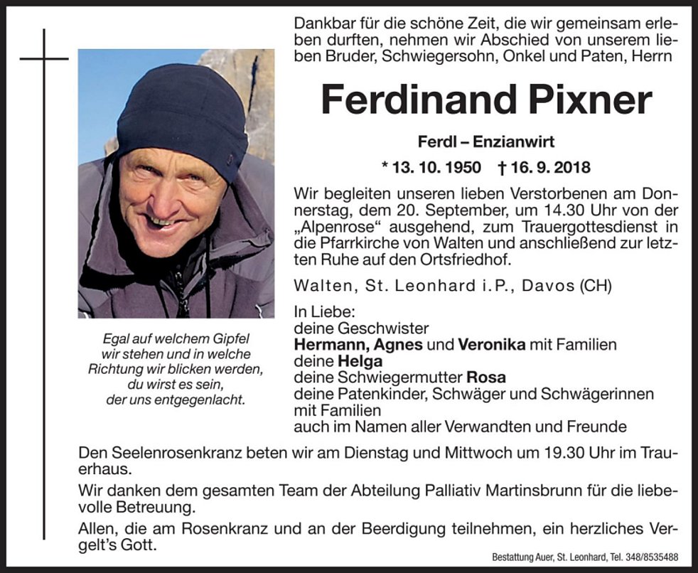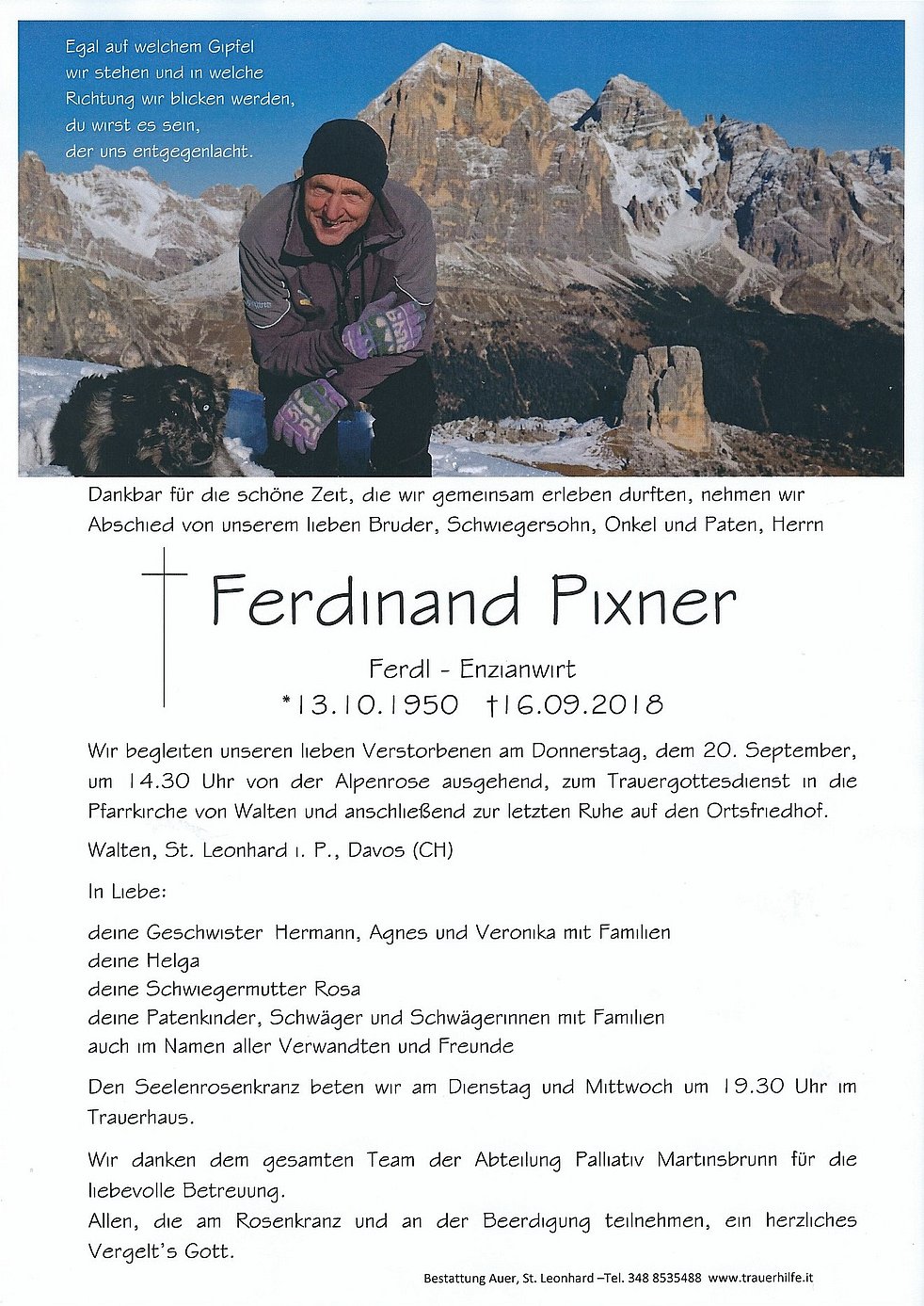Wir begleiten unseren lieben Verstorbenen am Donnerstag, dem 20. September, um 14.30 Uhr von der Alpenrose ausgehend, zum Trauergottesdienst in die Pfarrkirche von Walten und anschließend zur letzten Ruhe auf den Ortsfriedhof.