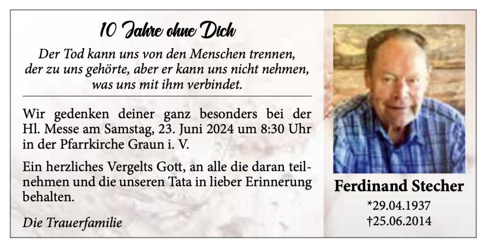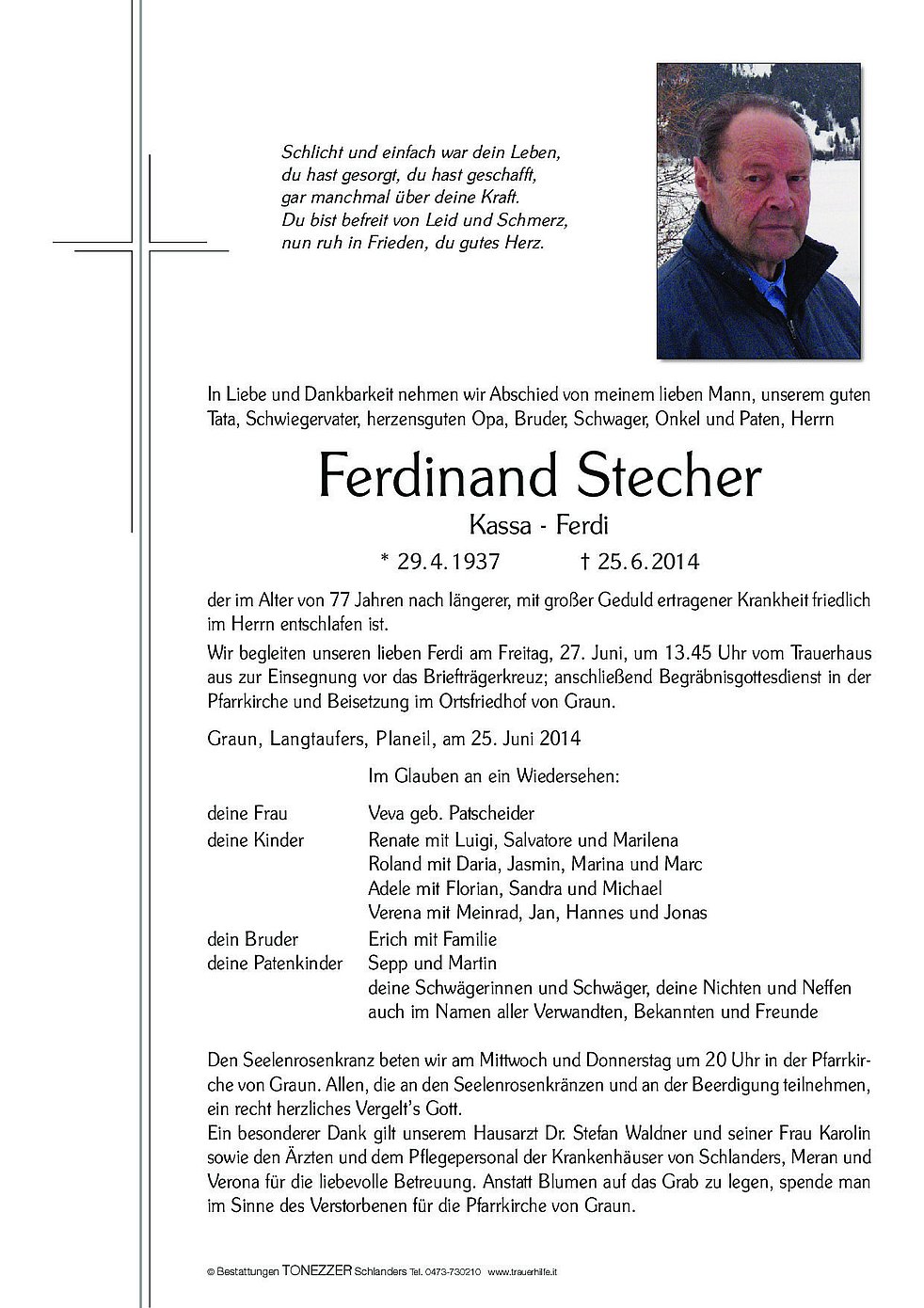 Wir begleiten unseren lieben Ferdi am Freitag, 27. Juni, um 13.45 Uhr vom Trauerhaus aus zur Einsegnung vor das Briefträgerkreuz; anschließend Begräbnisgottesdienst in der Pfarrkirche und Beisetzung im Ortsfriedhof von Graun.