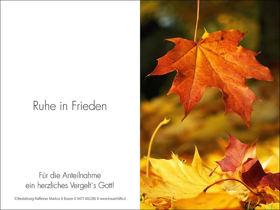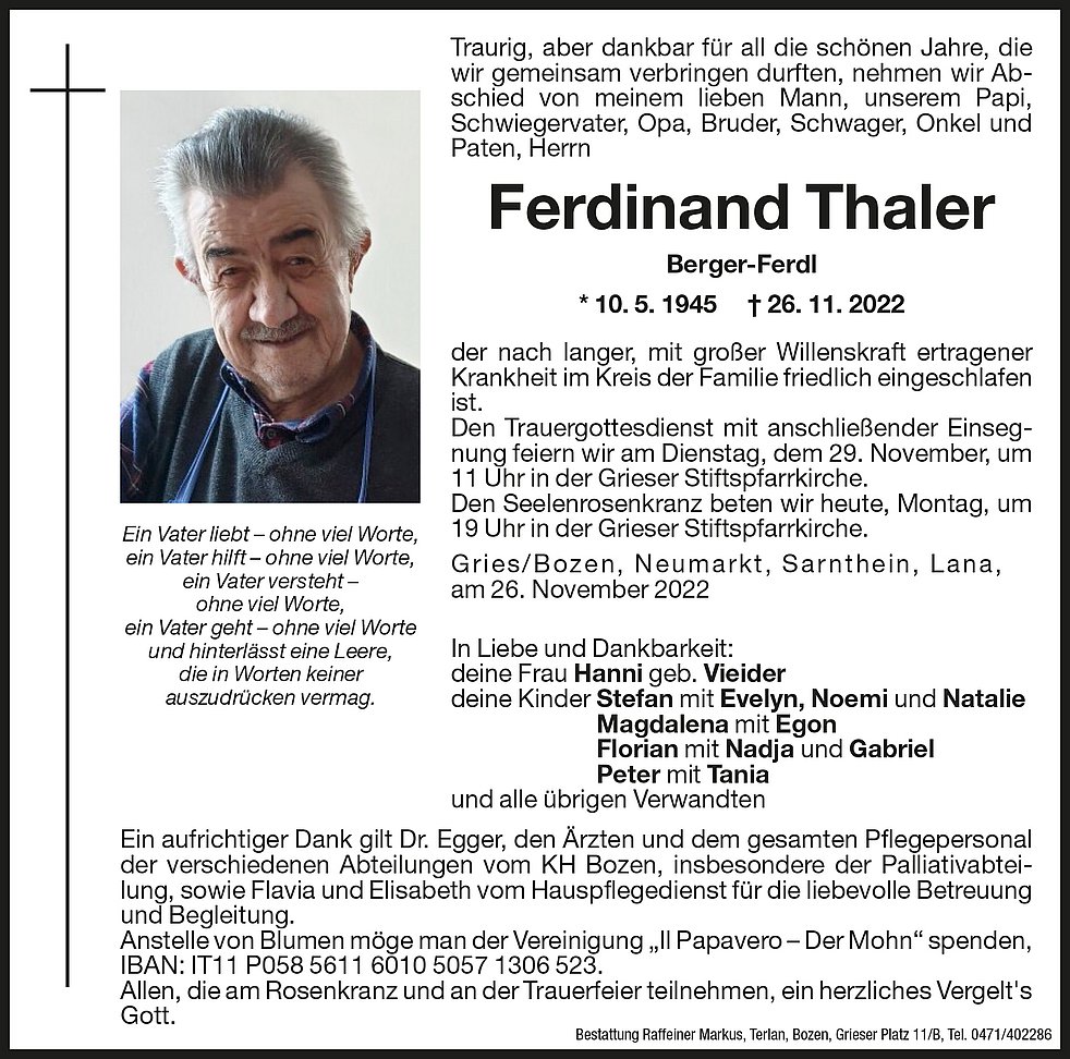 Ein aufrichtiger Dank gilt Dr. Egger, den Ärzten und dem gesamten Pflegepersonal der verschiedenen Abteilungen vom KH-Bozen, insbesondere der Palliativabteilung sowie Flavia und Elisabeth vom Hauspflegedienst für die liebevolle Betreuung und Begleitung.