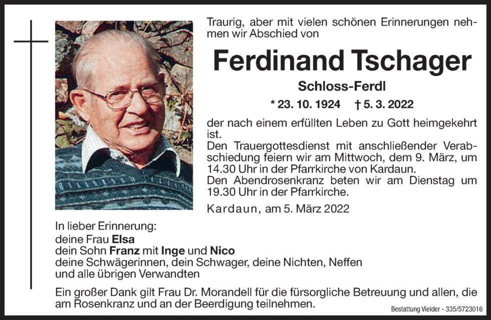 Den Trauergottesdienst mit anschließender Verabschiedung feiern wir am Mittwoch, dem 9. März, um 14.30 Uhr in der Pfarrkirche von Kardaun.