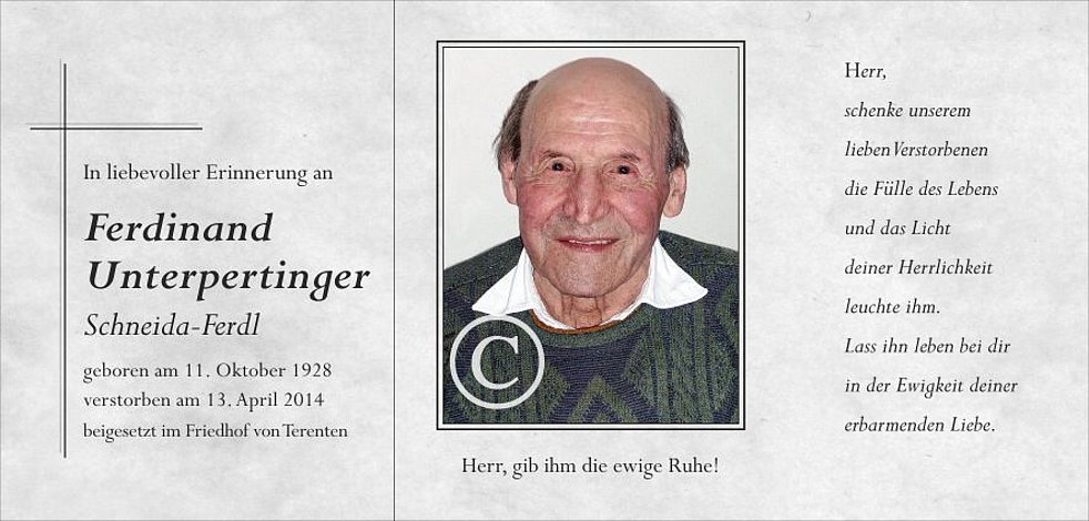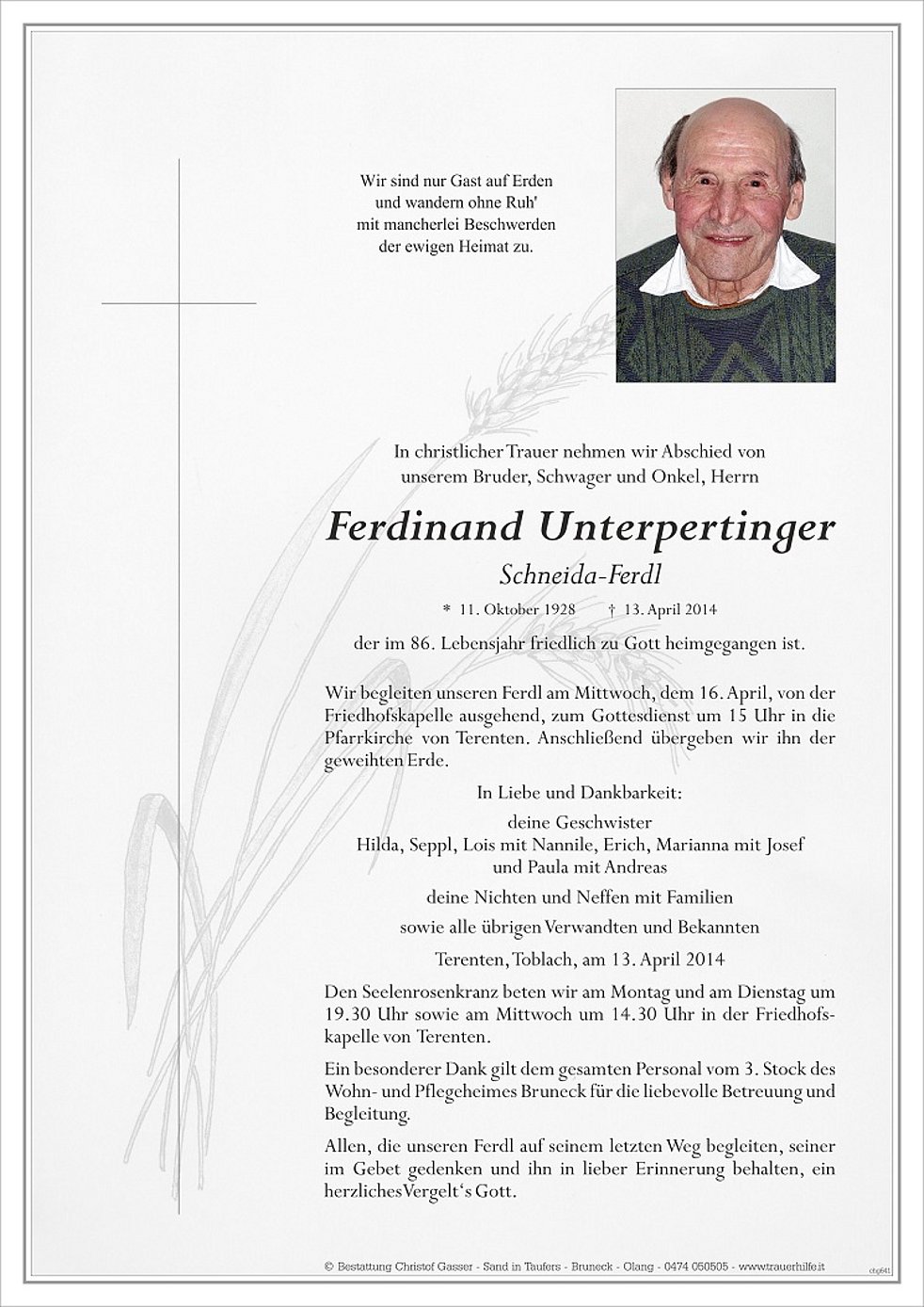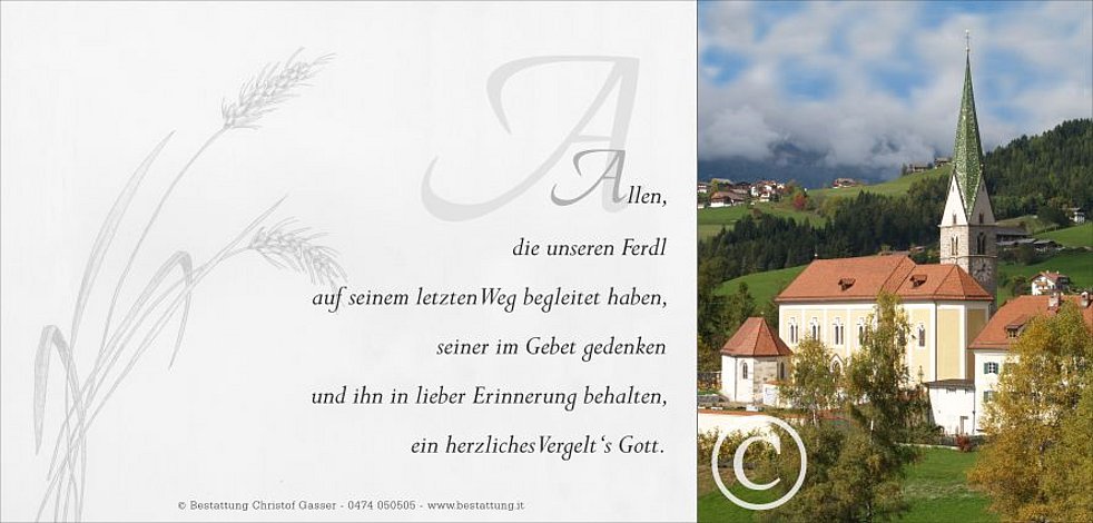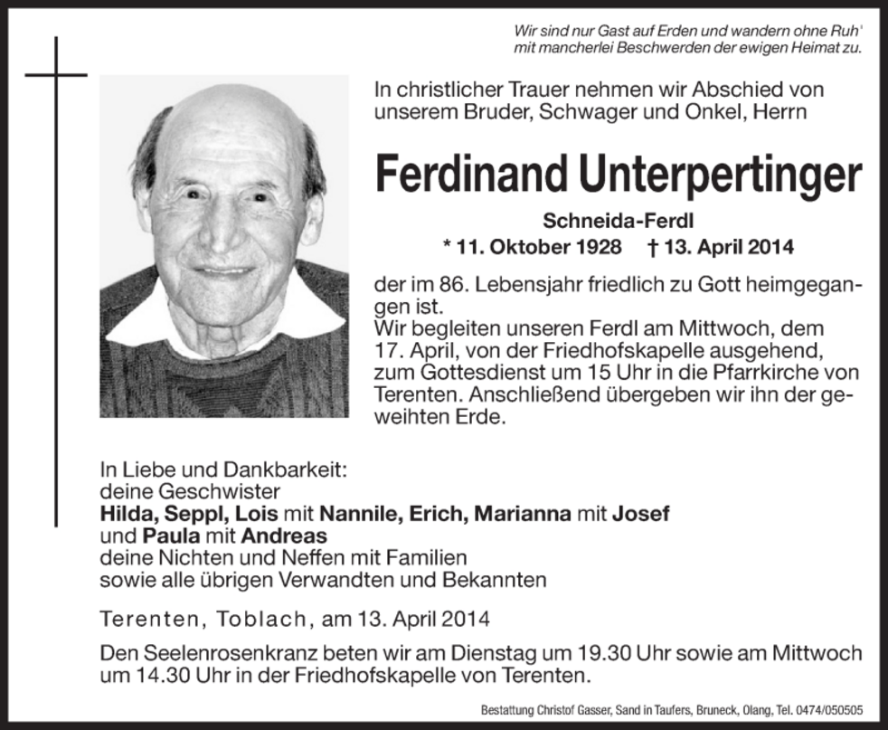 Wir begleiten unseren Ferdl am Mittwoch, dem 16. April, von der Friedhofskapelle ausgehend, zum Gottesdienst um 15 Uhr in die Pfarrkirche von Terenten. Anschließend übergeben wir ihn der geweihten Erde.