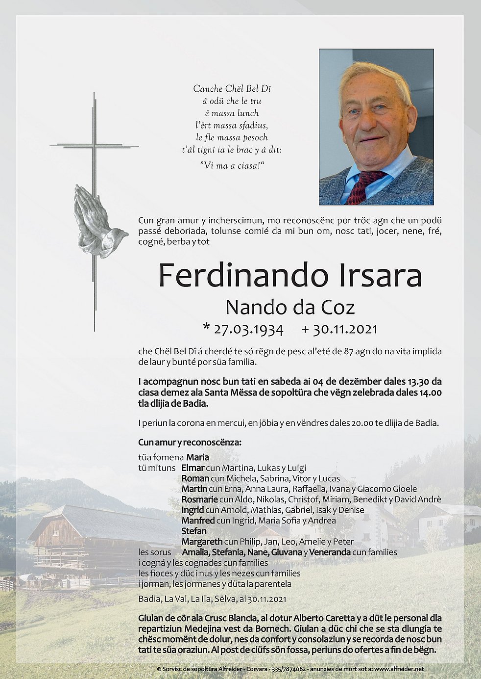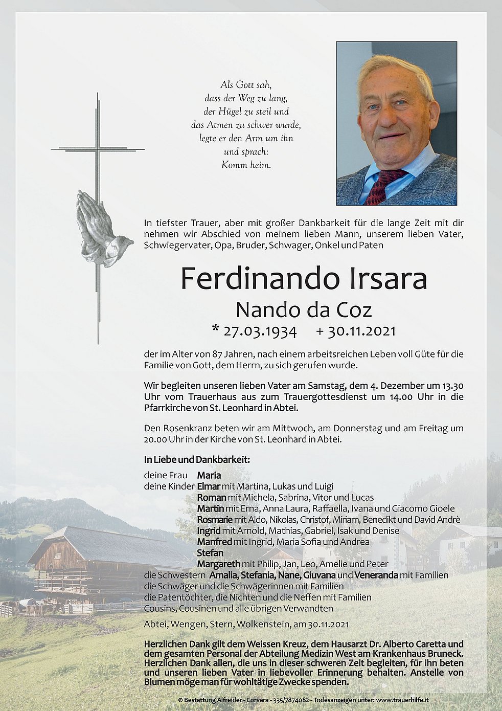Herzlichen Dank gilt dem Weissen Kreuz, dem Hausarzt Dr. Alberto Caretta und dem gesamten Personal der Abteilung Medizin West am Krankenhaus Bruneck. Herzlichen Dank allen, die uns in dieser schweren Zeit begleiten, für ihn beten und unseren lieben Vater in liebevoller Erinnerung behalten. Anstelle von Blumen möge man für wohltätige Zwecke spenden.