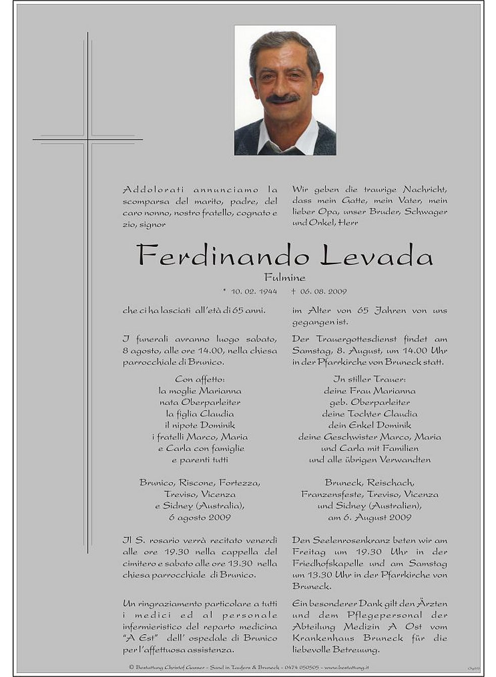 Der Trauergottesdienst findet am Samstag, 8. August, um 14.00 Uhr in der Pfarrkirche von Bruneck statt.