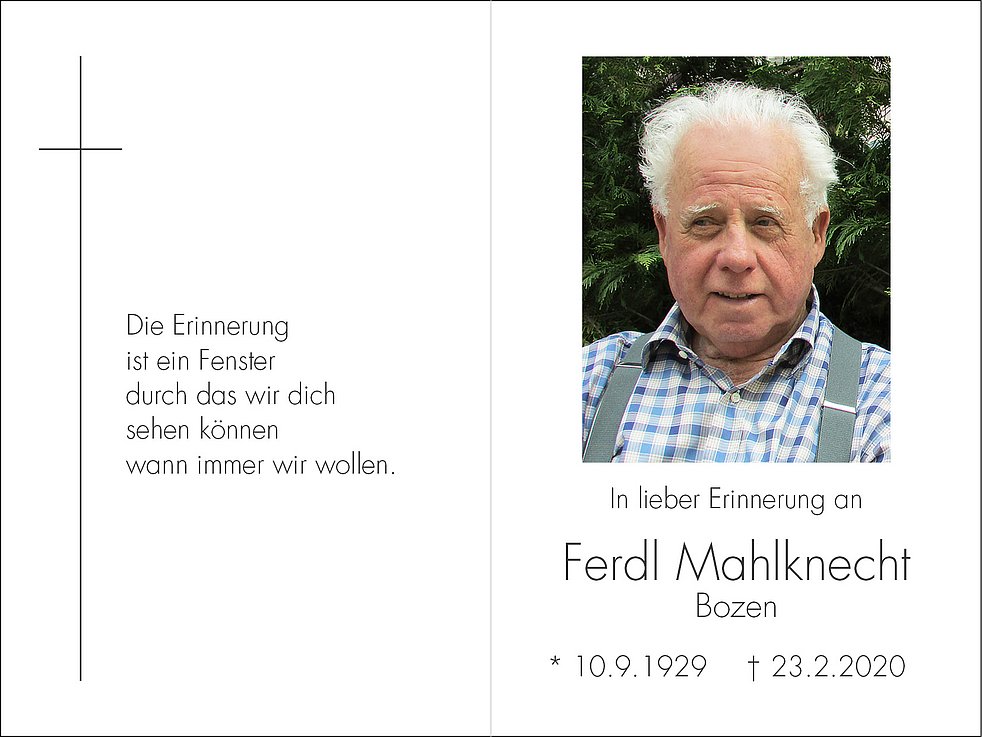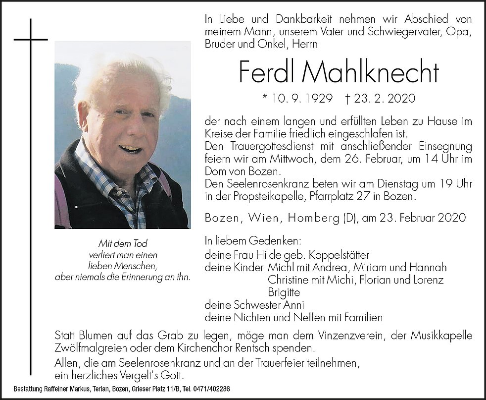 Den Trauergottesdienst mit anschlieβender Einsegnung feiern wir am Mittwoch, dem 26. Februar, um 14 Uhr im Dom von Bozen.