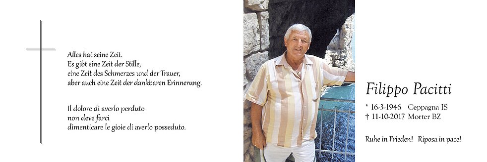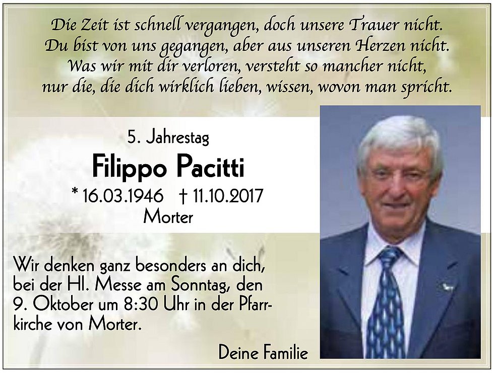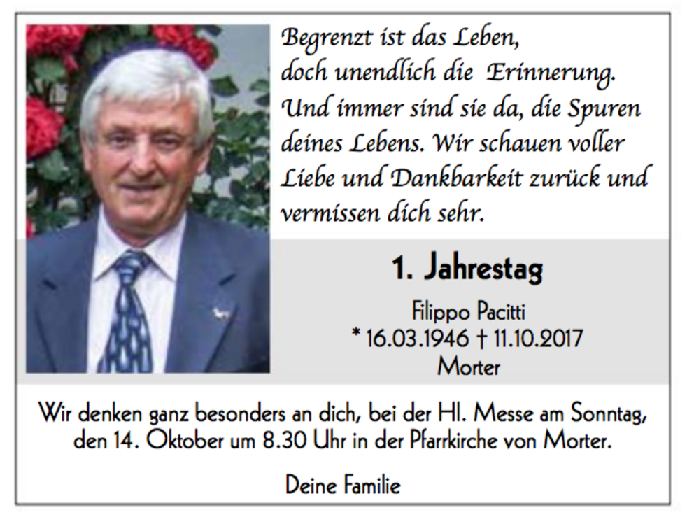 Wir begleiten unseren lieben Verstorbenen am Samstag, 14. Oktober, um 14 Uhr von der Leichenkapelle aus zum Begräbnisgottesdienst in die Pfarrkirche und anschließend zur letzten Ruhe auf den Ortsfriedhof von Morter.