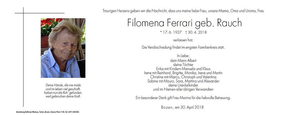 Traurigen Herzens geben wir die Nachricht, dass uns meine liebe Frau, unsere Mama, Oma und Uroma, Frau