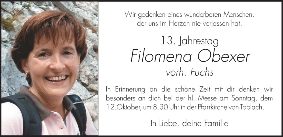 Gemeinsam begleiten wir meine liebe Frau und unsere Mama am Samstag, dem 13. Oktober, um 13.30 Uhr vom Trauerhaus ausgehend, zum Gottesdienst um 14.00 Uhr in die Pfarrkirche von Toblach und anschließend zur Beisetzung im Familiengrab.