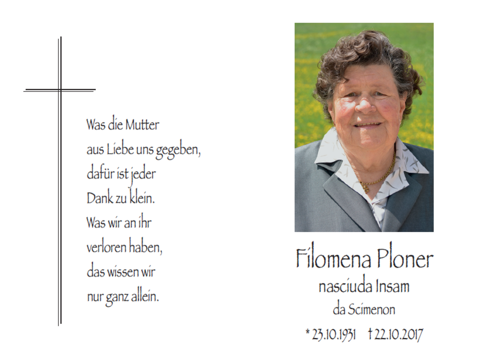 Gemeinsam begleiten wir unsere liebe Mama am Dienstag 24. Oktober, um 13.45 Uhr, vom Trauerhaus ausgehend, in die Pfarrkirche von St. Christina zur letzten Ruhe.