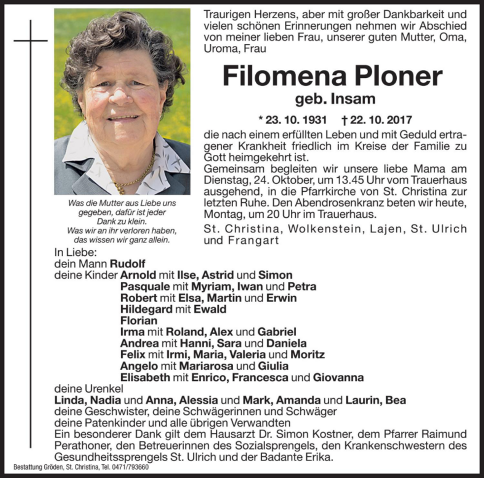 Ein besonderer Dank gilt dem Hausarzt Dr. Simon Kostner, dem Pfarrer Raimund Perathoner, den Betreuerinnen des Sozialsprengels, den Krankenschwestern des Gesundheitssprengels St. Ulrich und der Badante Erika.