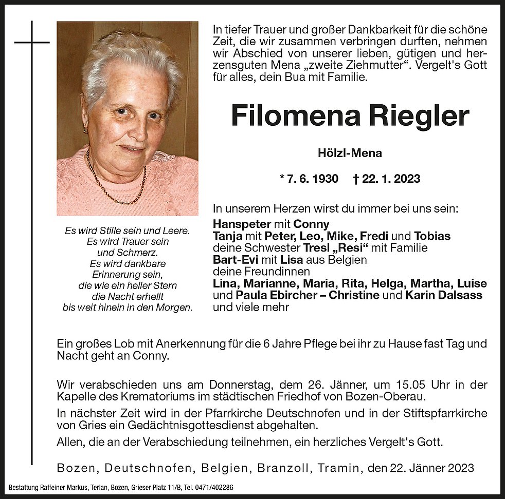Wir verabschieden uns am Donnerstag, dem 26. Jänner, um 15.05 Uhr in der Kapelle des Krematoriums im städtischen Friedhof von Bozen Oberau.