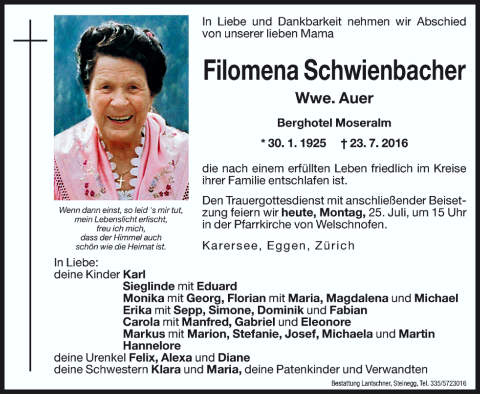 Den Trauergottesdienst mit anschließender Beisetzung feiern wir am Montag,