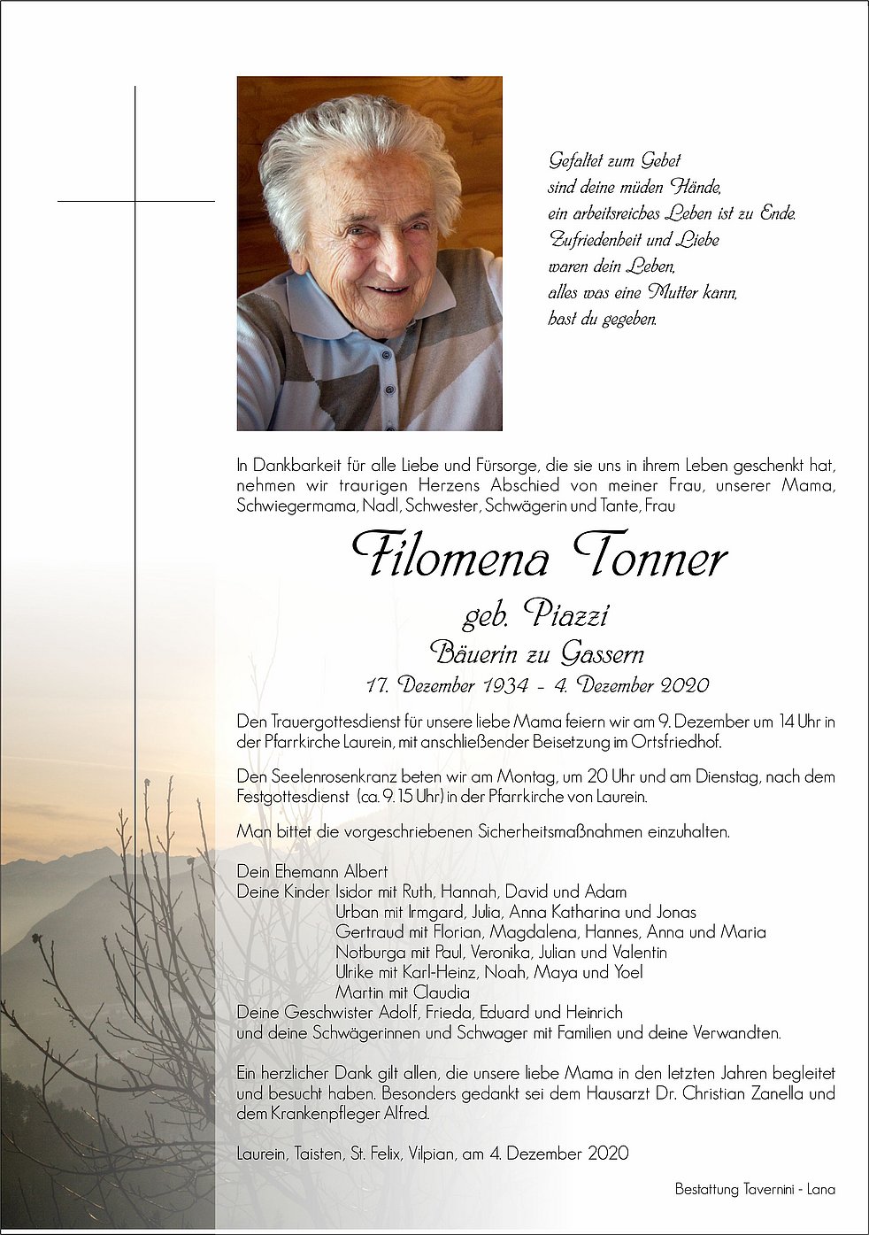 Liebe Familie Tonner, mein aufrichtiges Beileid am Tod eurer lieben Mama! Ich wünsche euch von Herzen Kraft u.Zuversicht in dieser schweren Zeit des Abschieds.