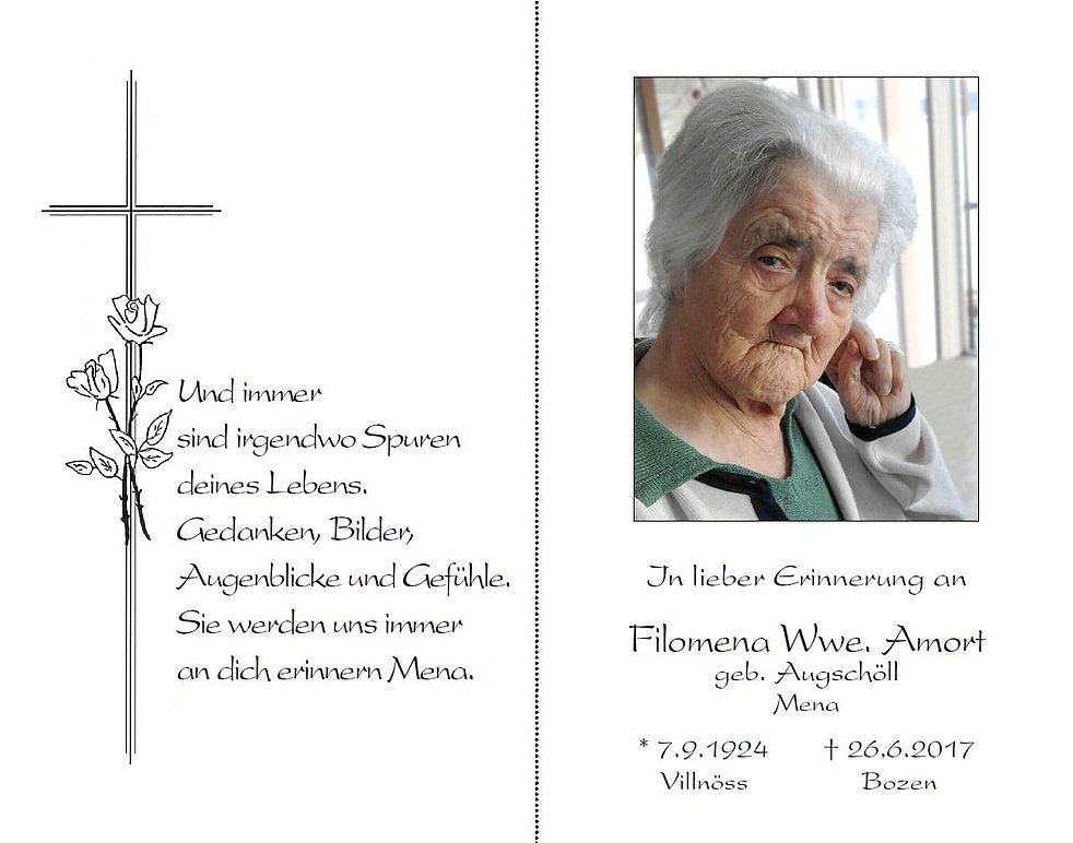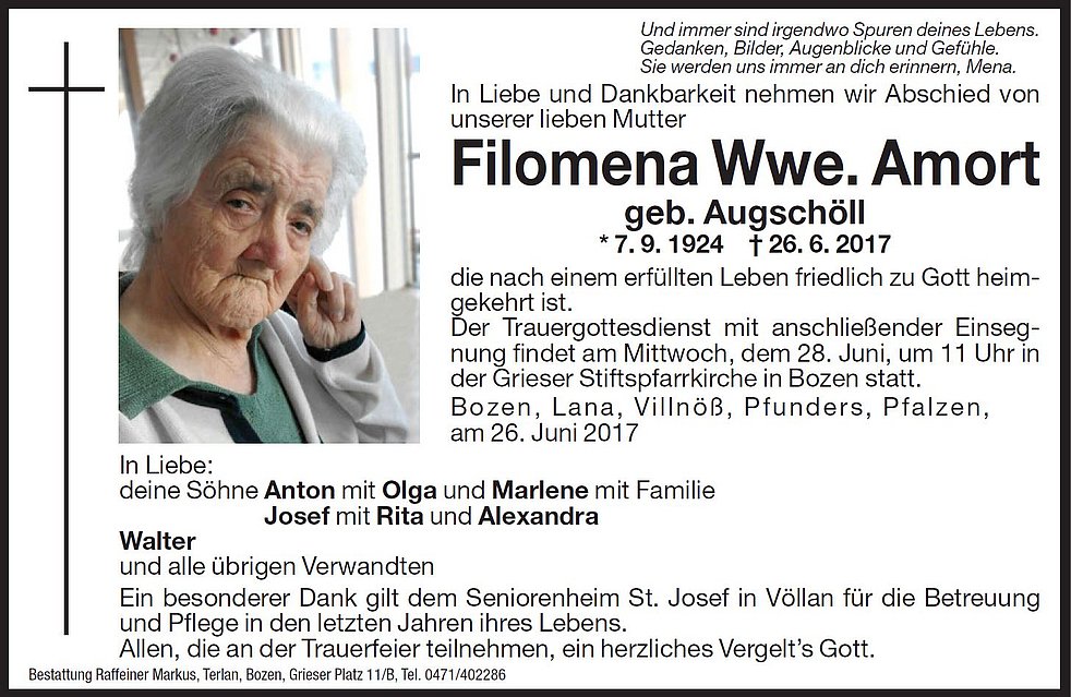 Ein besonderer Dank gilt dem Seniorenheim St. Josef in Völlan für die Betreuung und Pflege in den letzten Jahren ihres Lebens.