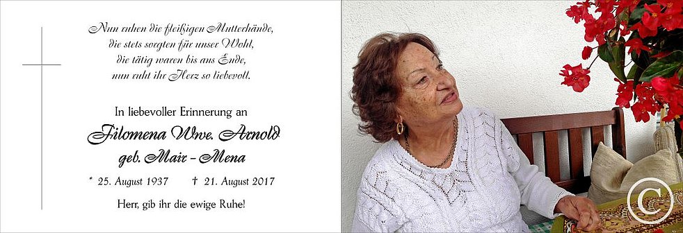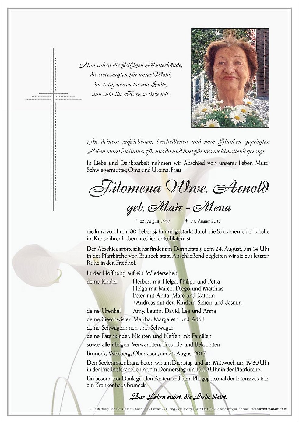 Der Abschiedsgottesdienst findet am Donnerstag, dem 24. August, um 14 Uhr in der Pfarrkirche von Bruneck statt. Anschließend begleiten wir sie zur letzten Ruhe in den Friedhof.