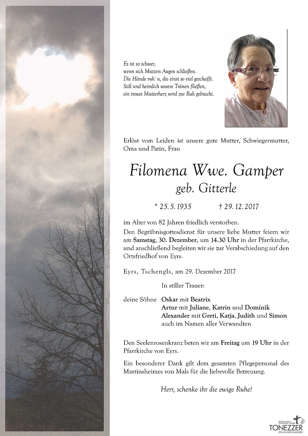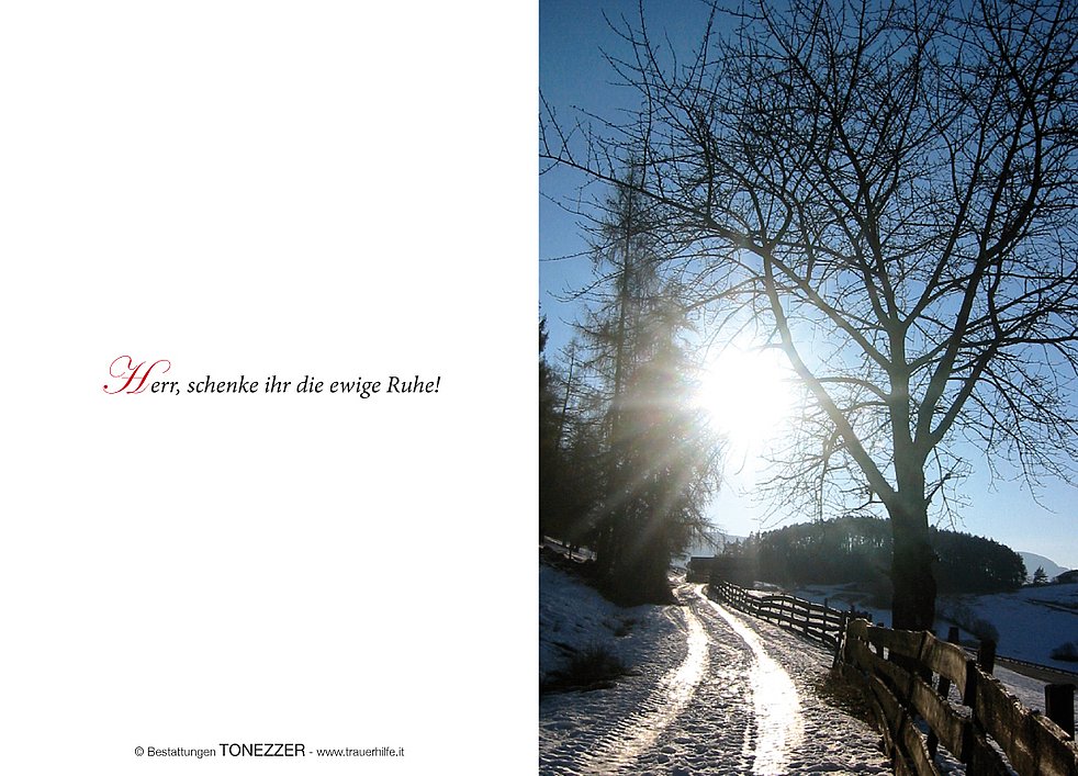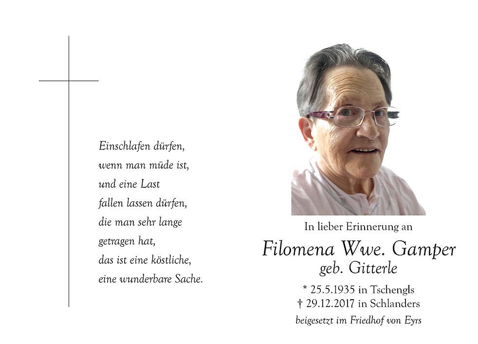 Den Begräbnisgottesdienst für unsere liebe Mutter feiern wir am Samstag, 30. Dezember, um 14.30 Uhr in der Pfarrkirche, und anschließend begleiten wir sie zur Verabschiedung auf den Ortsfriedhof von Eyrs.