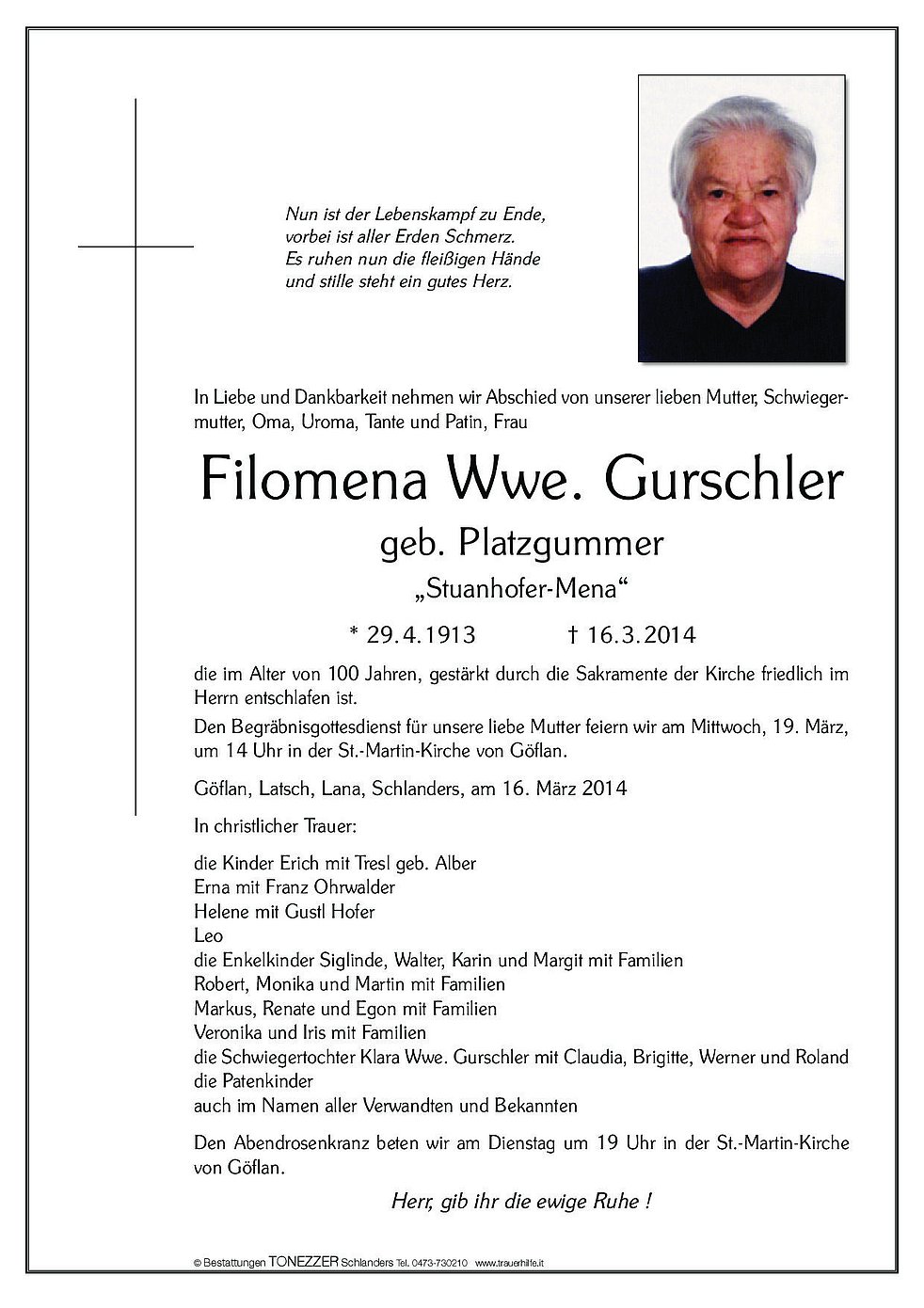Den Begräbnisgottesdienst für unsere liebe Mutter feiern wir am Mittwoch, 19. März, um 14 Uhr in der St.-Martin-Kirche von Göflan.