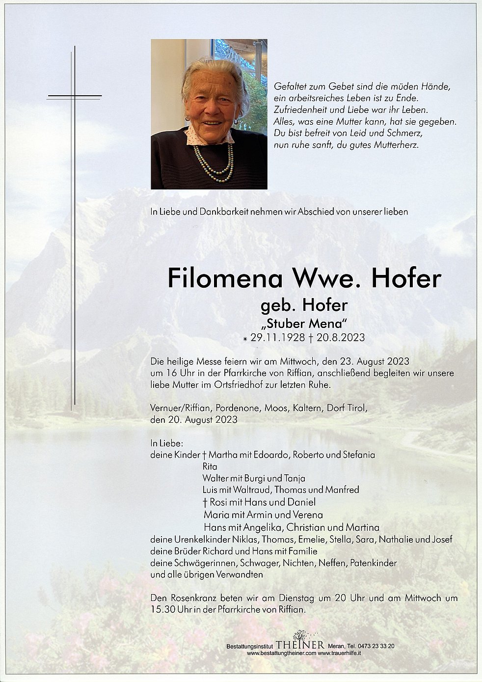Die heilige Messe feiern wir am Mittwoch, den 23. August 2023 um 16 Uhr in der Pfarrkirche von Riffian, anschließend begleiten wir unsere liebe Mutter im Ortsfriedhof zur letzten Ruhe.
