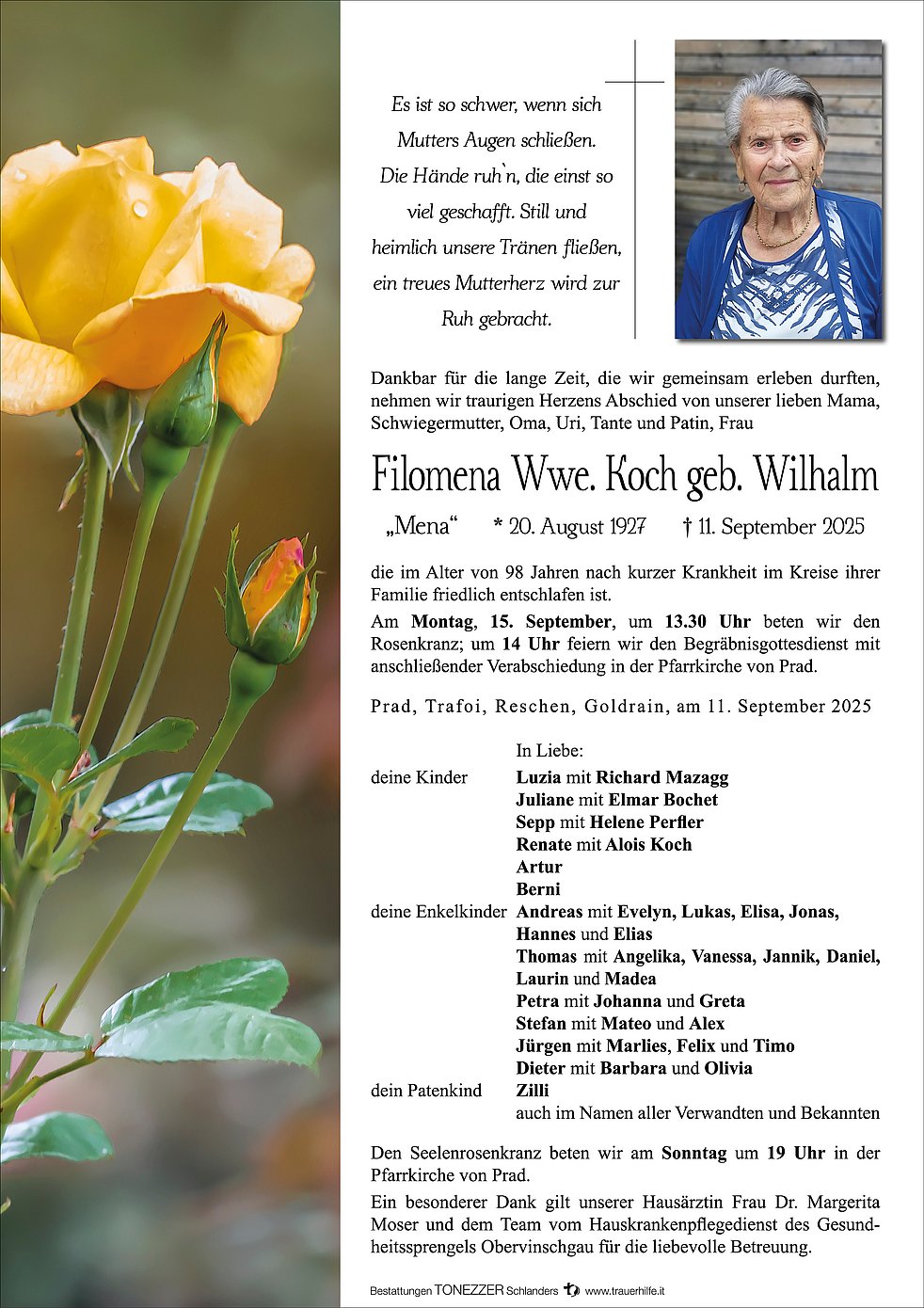 Am Montag, 15. September, um 13.30 Uhr beten wir den Rosenkranz; um 14 Uhr feiern wir den Begräbnisgottesdienst mit anschließender Verabschiedung in der Pfarrkirche von Prad.
