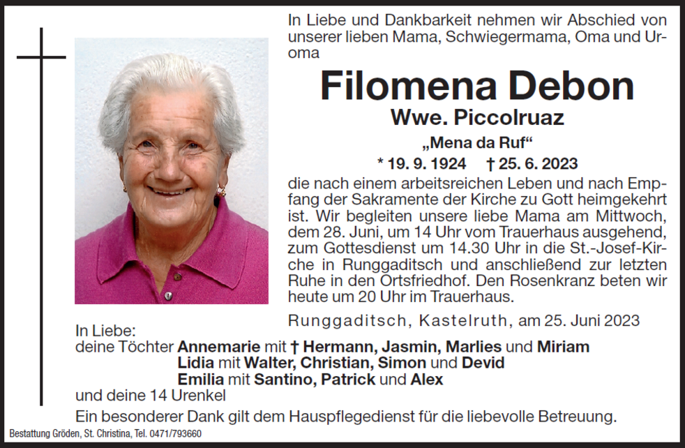 Wir begleiten unsere liebe Mama am Mittwoch, dem 28. Juni, um 14 Uhr vom Trauerhaus ausgehend, zum Gottesdienst um 14.30 Uhr in die St.-Josef-Kirche in Runggaditsch und anschließend zur letzten Ruhe in den Ortsfriedhof.