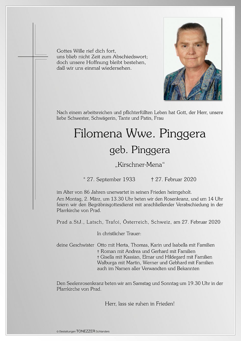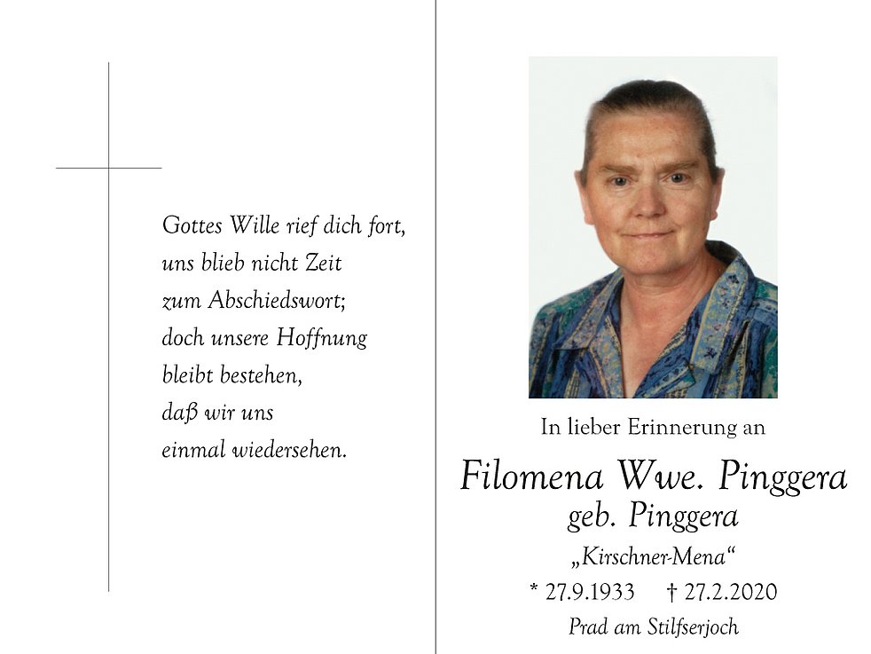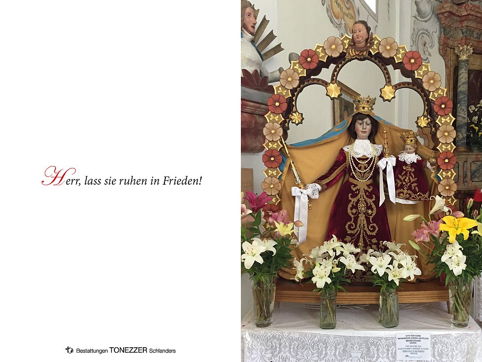 Am Montag, 2. März, um 13.30 Uhr beten wir den Rosenkranz, und um 14 Uhr feiern wir den Begräbnisgottesdienst mit anschließender Verabschiedung in der Pfarrkirche von Prad.