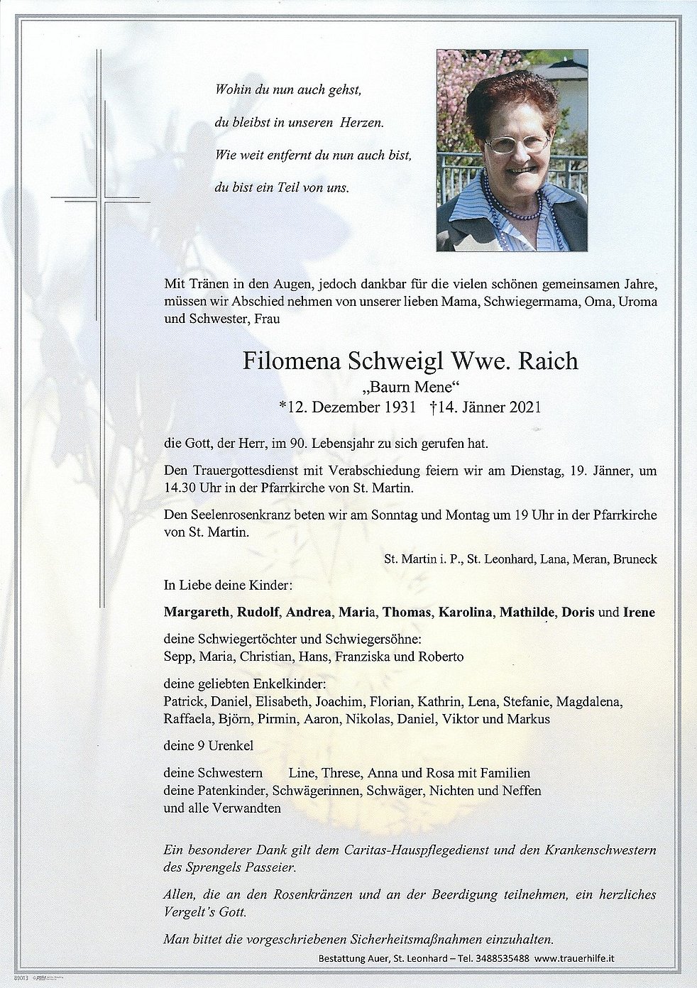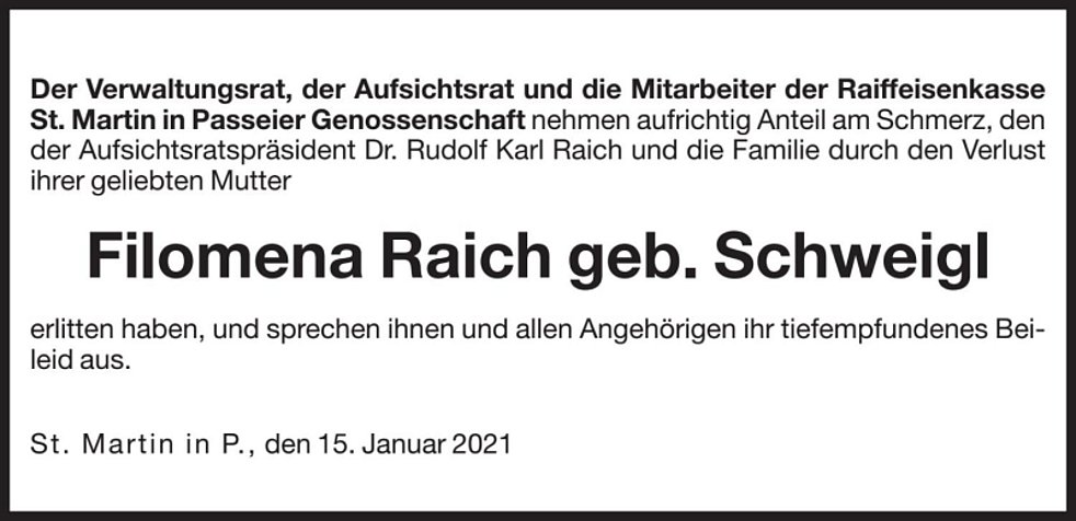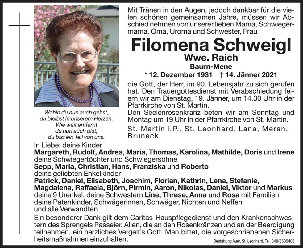 Den Trauergottesdienst mit Verabschiedung feiern wir am Dienstag, 19. Jänner, um 14.30 Uhr in der Pfarrkirche von St. Martin.