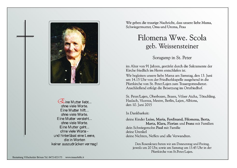 um 14.15 Uhr von der Friedhofskapelle ausgehend in die Pfarrkirche von St. Peter/Lajen zum Trauergottesdienst. Anschließend erfolgt die Beisetzung im Ortsfriedhof.