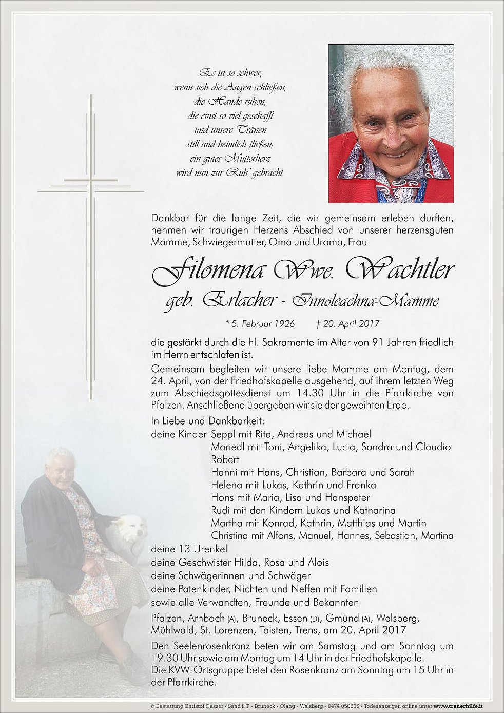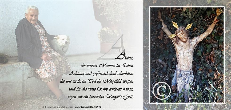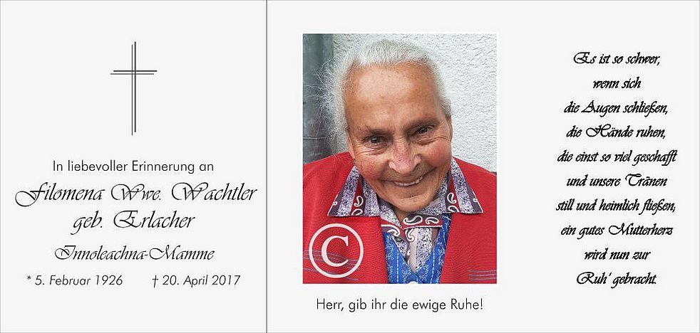 Gemeinsam begleiten wir unsere liebe Mamme am Montag, dem 24. April, von der Friedhofskapelle ausgehend, auf ihrem letzten Weg zum Abschiedsgottesdienst um 14.30 Uhr in die Pfarrkirche von Pfalzen. Anschließend übergeben wir sie der geweihten Erde.