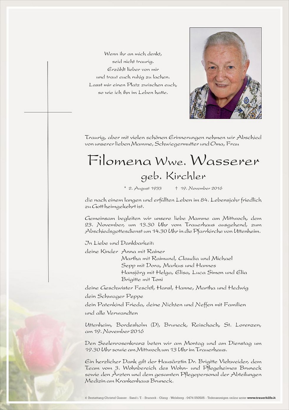 Gemeinsam begleiten wir unsere liebe Mamme am Mittwoch, dem 23. November, um 13.30 Uhr vom Trauerhaus ausgehend, zum Abschiedsgottesdienst um 14.30 Uhr in die Pfarrkirche von Uttenheim.