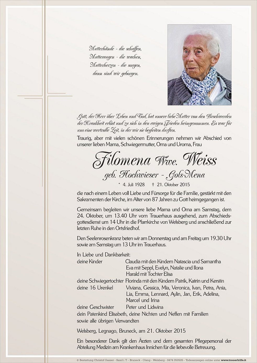 24. Oktober, um 13.40 Uhr vom Trauerhaus ausgehend, zum Abschieds-gottesdienst um 14 Uhr in die Pfarrkirche von Welsberg und anschließend zur letzten Ruhe in den Ortsfriedhof.