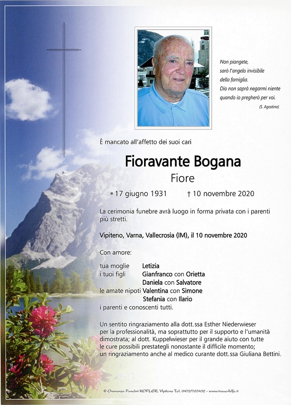 Un sentito ringraziamento alla dott. ssa Esther Niederwieser per la professionalità, ma soprattutto per il supporto e l‘umanità dimostrata; al dott. Kuppelwieser per il grande aiuto con tutte le cure possibili prestategli nonostante il difficile momento; un ringraziamento anche al medico curante dott. ssa Giuliana Bettini.