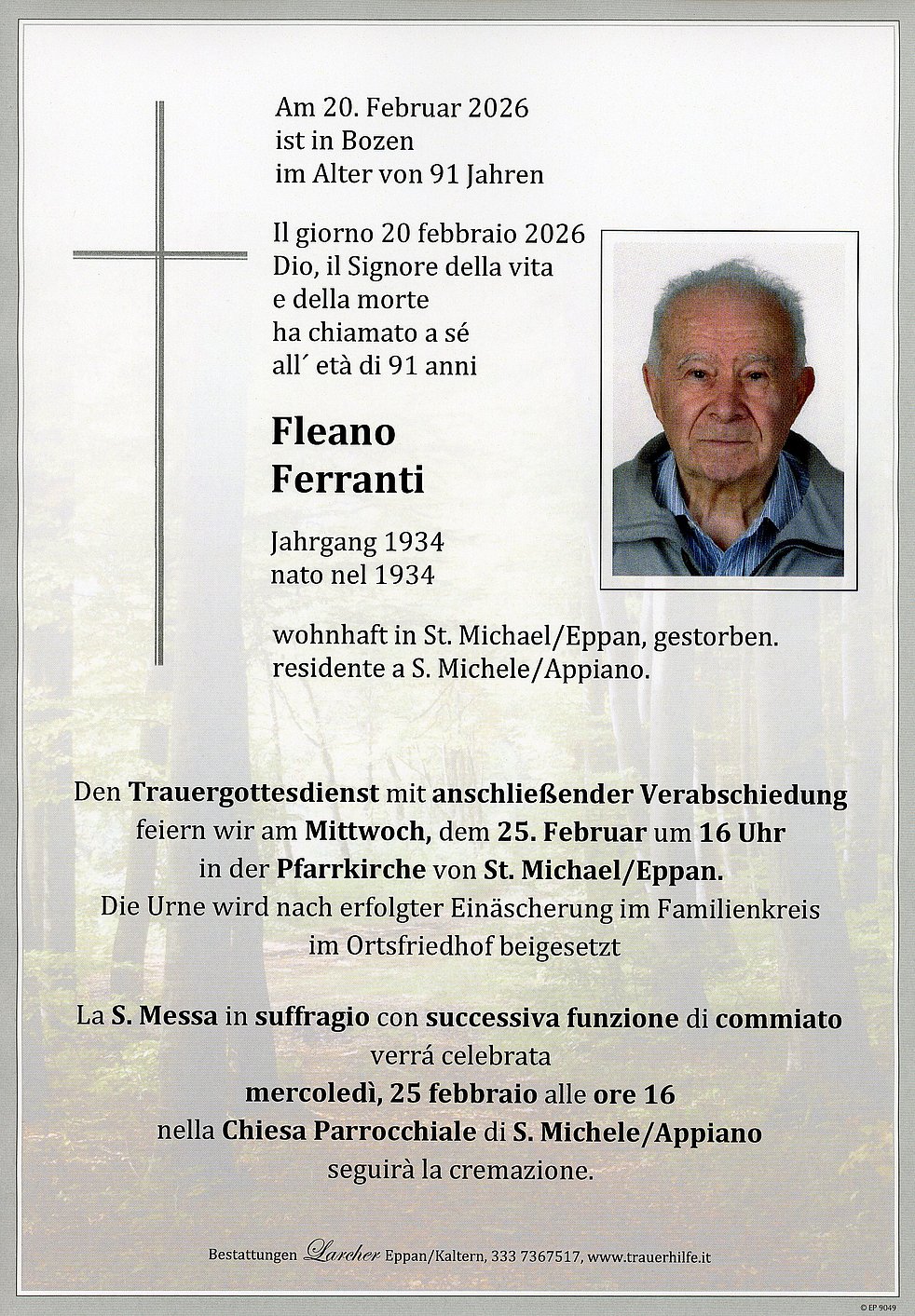 Den Trauergottesdienst mit anschließender Verabschiedung feiern wir am Mittwoch, dem 25. Februar um 16 Uhr in der Pfarrkirche von St. Michael/Eppan.