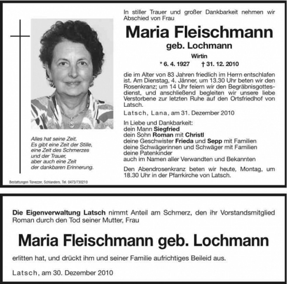Am Dienstag, 4. Jänner, um 13.30 Uhr beten wir den Rosenkranz; um 14 Uhr feiern wir den Begräbnisgottesdienst und anschließend begleiten wir unsere liebe Verstorbene zur letzten Ruhe auf den Ortsfriedhof von Latsch.
