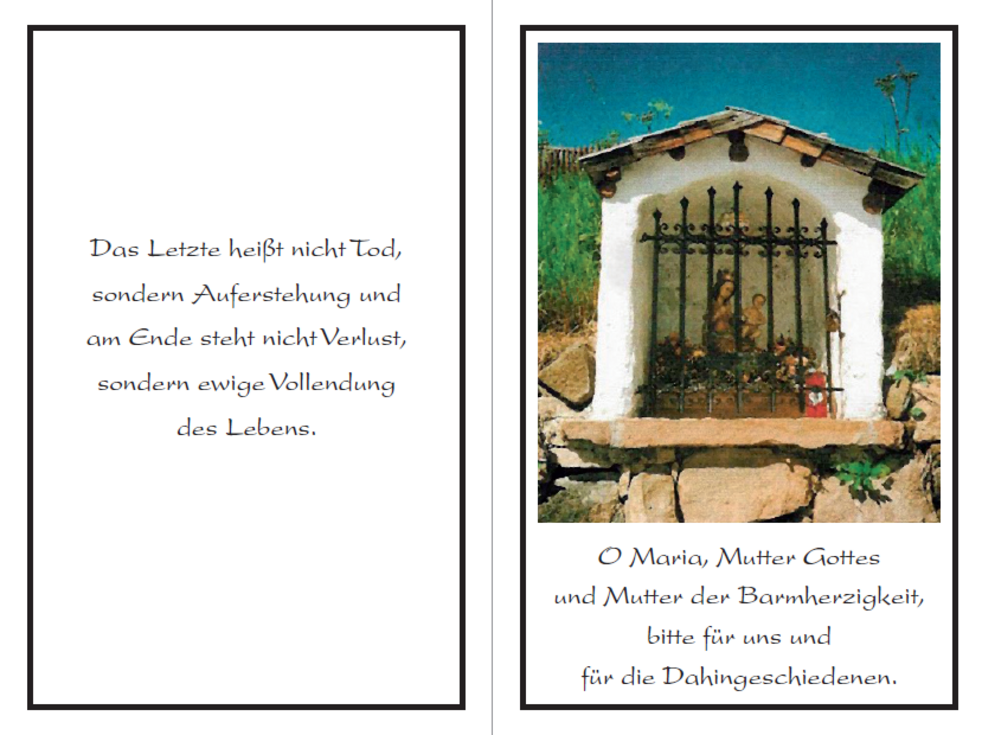 Allen, die am Rosenkranz und an der Beerdigung teilnehmen, ihrer im Gebet gedenken und sie in lieber Erinnerung behalten, ein herzliches Vergelt’s Gott.