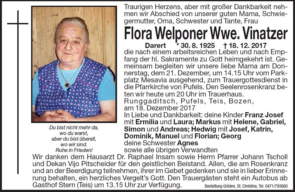 Gemeinsam begleiten wir unsere liebe Mama am Donnerstag, dem 21. Dezember, um 14.15 Uhr vom Parkplatz Mesavia ausgehend, zum Trauergottesdienst in die Pfarrkirche von Pufels und anschließend in den Ortsfriedhof zur letzten Ruhe.