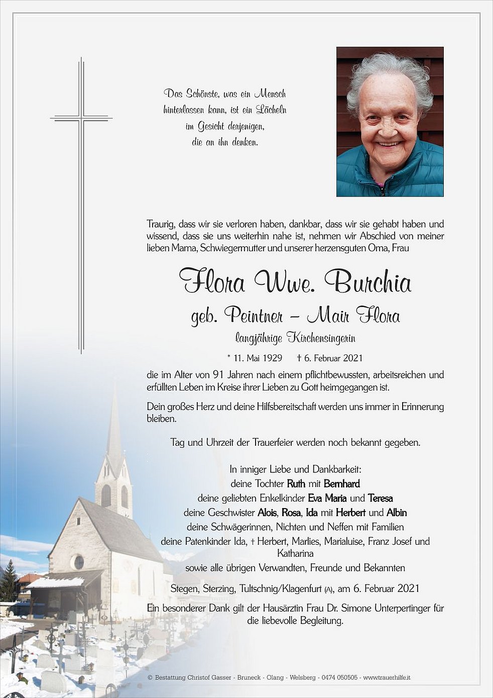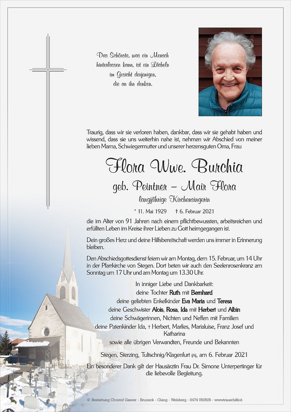 Den Abschiedsgottesdienst feiern wir am Montag, dem 15. Februar, um 14 Uhr in der Pfarrkirche von Stegen. Dort beten wir auch den Seelenrosenkranz am Sonntag um 17 Uhr und am Montag um 13.30 Uhr.