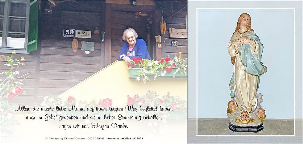 Traurig, dass wir sie verloren haben, dankbar, dass wir sie gehabt haben und wissend, dass sie uns weiterhin nahe ist, nehmen wir Abschied von meiner lieben Mama, Schwiegermutter und unserer herzensguten Oma, Frau