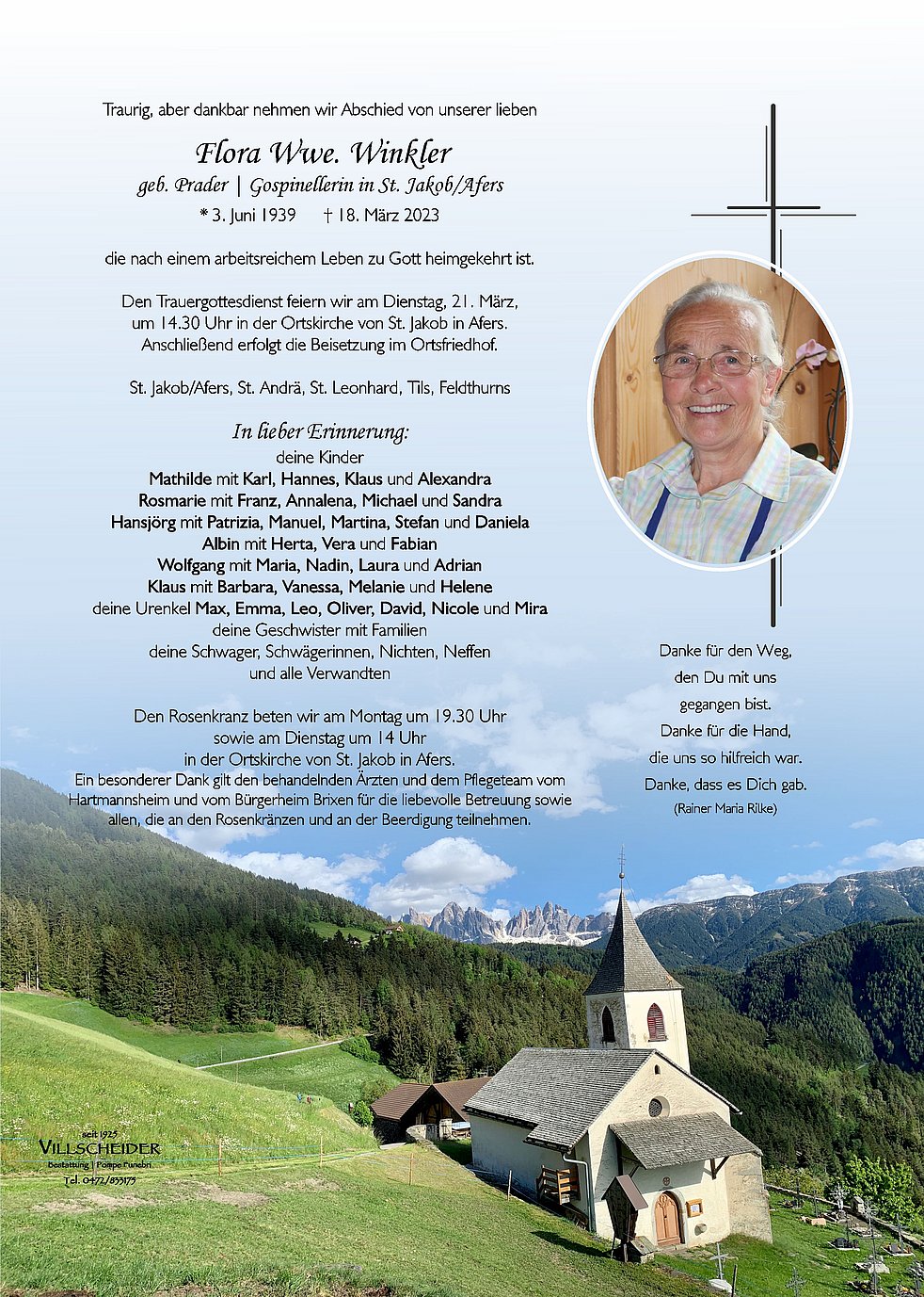 Begräbnisgottesdienst: 21.03. - 14:30 Uhr St. Jakob/Afers